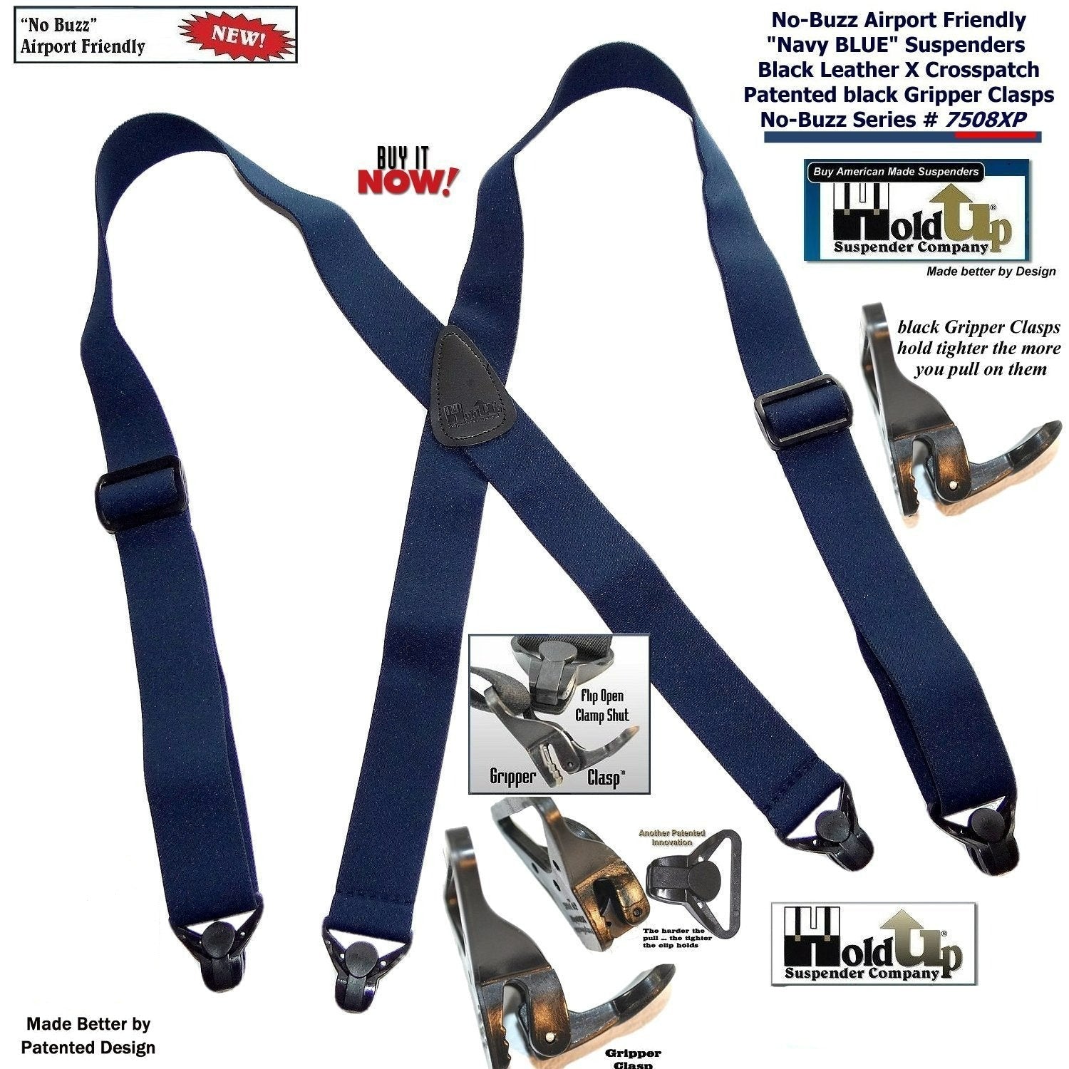 Breeze through Airport Security in these dark navy blue no-alarm Holdup brand X-back suspenders! The sort of man who ends his day on a high-rise balcony, toasting his boardroom victories with a scotch and cigar, is not a man who strips off his suspenders in the airport and ends up with his pants around his ankles. Nor should YOU be. Instead, get these blue "no alarm" suspenders with Patented sure-gripping composite plastic gripper clasps and pass easily through security metal detectors. TheĀ USA patented plastic gripper clasps are cam activated which means the harder you pull on them the tighter they grip. Dressy X-back designed black leather crosspatch embossed with our HoldUp logo keeps you looking your business-like best with a blue color that goes perfectly with any solid color or plaid shirt. Great too for suspender wearers who have to pass through building security metal detectors. Buy Holdup No-Buzz Series Suspenders in normal and XL length in several colors. BONUS offer: Buy here using yourĀ Amazon or PayPal account and favorite debit/Credit card and getĀ free standard freight offer during checkout.