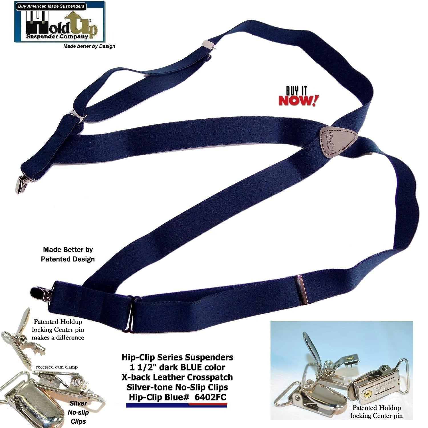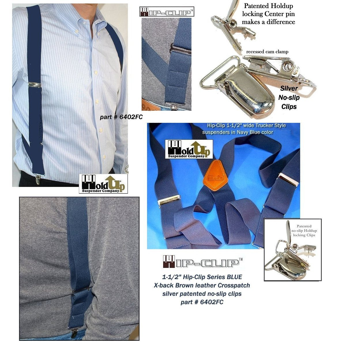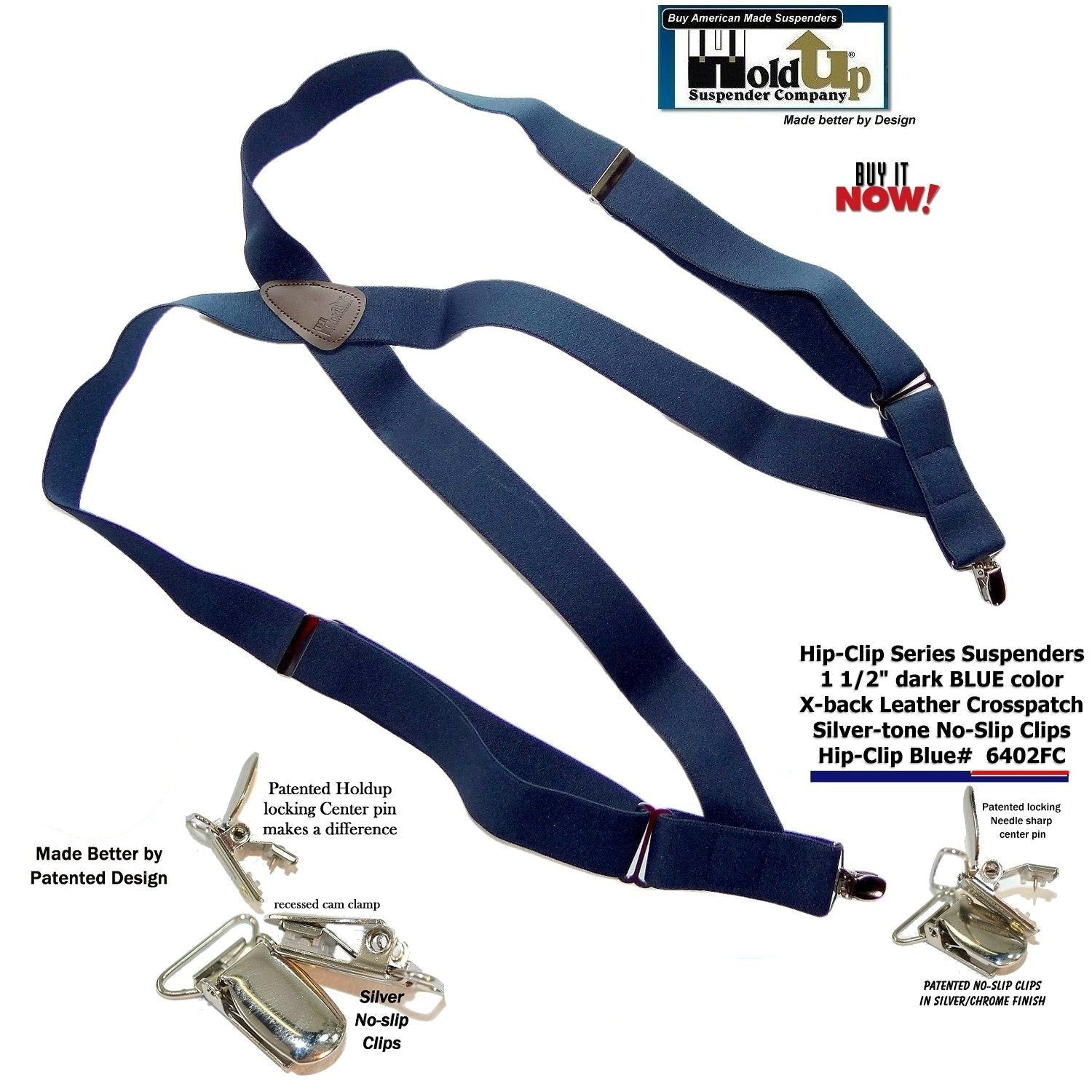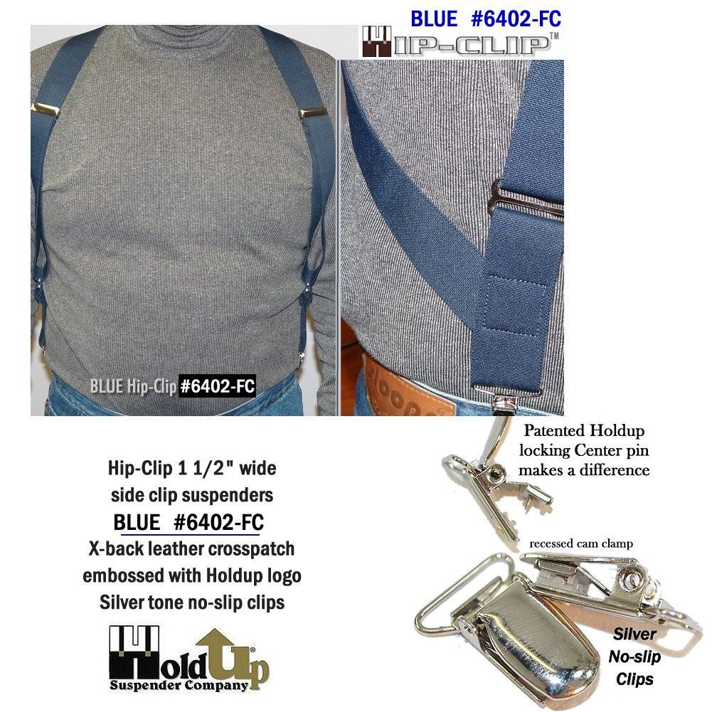 Well Hold-Up Suspenders has done it again and introduces an innovative Navy BLUE Trucker, or side-clip suspender, called the Hip-Clip Style. Now you can comfortably hold up any weight pants with just the snap of 2 of our exclusive silver/chrome plated NO-SLIP clips at the side of your pants. Keep your pants in the right place with our rugged side clip suspenders. You just slip your arms through these like you do shoulder holsters and backpack straps. They're designed with straps that crisscross your back and attach at the sides of pants or shorts. Slip them on like you would a backpack. 1-1/2" narrower strap width and 48" length with silver metal patented NO-SLIP clips. We stock Red, Navy Blue, Tan or Black colors - all with brown leather X-back crosspatch. Sometimes called "trucker" suspenders, or side clip suspenders, they're designed to never fly open when sliding across truck or car seat covers as they attach to the sides of your pants. All the holding power of our NO-SLIP suspender clips with the convenient ability to attach to the sides of your pants for ease of going to the bathroom. Buy here using your Amazon or PayPal account and get a free freight offer at checkout.