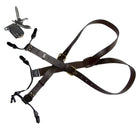 The antique brass tone buckle length adjuster and dark brown elastic comfort fit back strap make these bonded leather suspender braces comfortable to wear every day. These 1 inchĀ wide Brown strap leather Holdup Suspenders look and wear like old fashion western style cowboy suspender braces. The USA patented No-slip black clips attach at the top of the waistband to prevent waistband rollover so common with button on suspenders. Securely Order these dark brown bonded leather Strap style Double-Ups suspender braces here at Amazon using your credit card. We know you'll love these Brown Bonded Leather stylish Holdups that come in Belt strap or braided styles and brown or black color choices by backing these with a no-questions asked 30 day money back quality guarantee. These Holdup Leather casual Suspenders are made from top quality materials and are well worth the price.