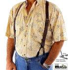 Men's Brown Bonded leather clip-on suspenders in the western belt strap style with antique finished brass belt buckle length adjuster and the patented shiny blackĀ No-slipĀ centerĀ pin type clips. These bonded brown leather Holdup brand suspenders are made to fit men up to 6' 1" tall and are adjustable to a max length of 48" so they adjust to fit men toĀ 6 feet tall. These are part of the Holdup Suspender Company Leather Series of suspenders also sold here at Holdupsuspenders.com.Ā These feature bonded leather 1" wide frontĀ strap with beltĀ buckle antique brass typeĀ length adjusters with 1 1/4" brown elastic back for total comfort.. These have bonded leatherĀ front straps and feature USA made brown cotton poly blend elastic back comfort strap. These Y-back LeatherĀ Holdups have real genuine BROWN leather crosspatch embossed with our Trademarked Hold-up logo. Buy here using your Amazon or PayPal account preferred payment card and get free standard freight on all orders.