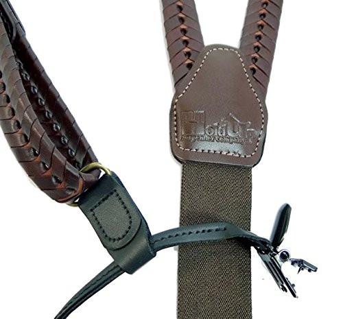 - Only real Holdup brand suspenders have our logo embossed into brown leather Y-back double stitched crosspatch with 1 1/4" brown elastic back for total comfort..