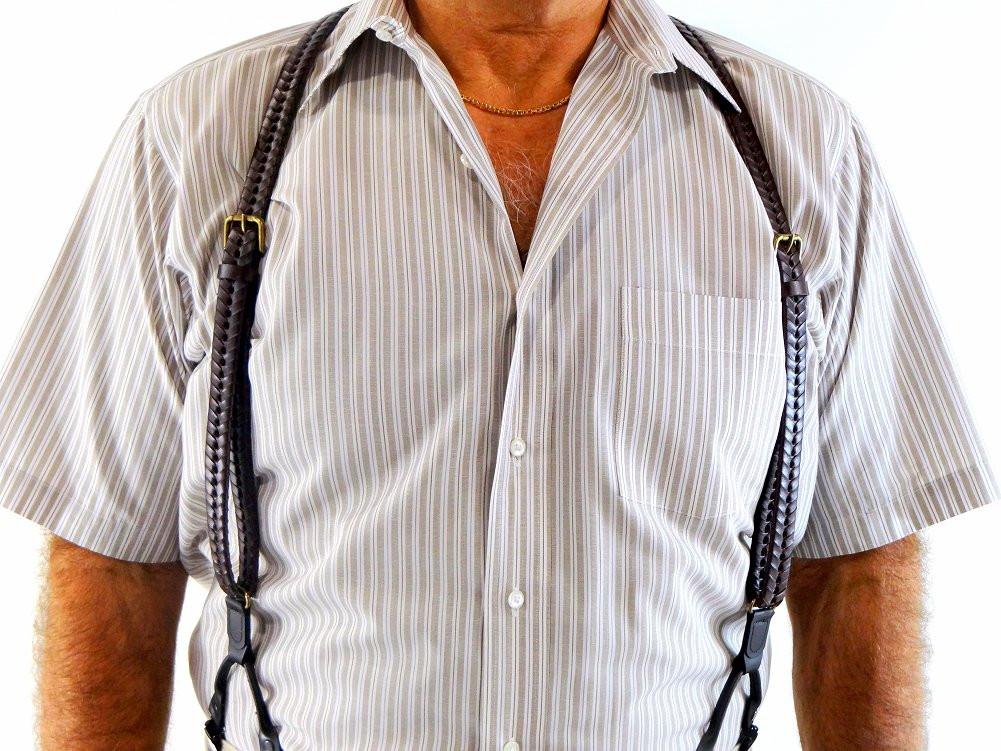 Beautiful 3/4" wide old fashion western wear suspender braces in split brown braided leather. Hold-up; exclusive No-slip patented black clips will hold these dual clip Double-Ups styles leather Holdups securely on jeans, slacks or dress pants. The fashion conscious modern man loves the look these thinner leather braided suspenders give them at the office and at happy hour bars and restaurants. Change your look at the snap of a Holdup clip!