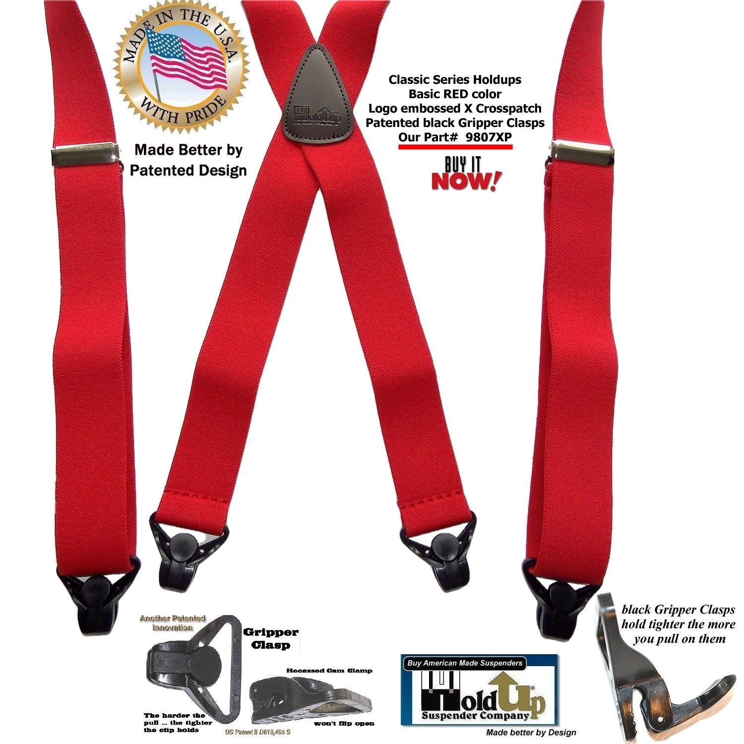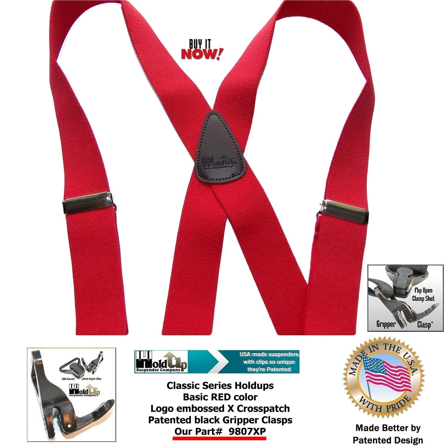 NEW - Classic Series Holdup Suspenders now come in a basic deep "Red" solid color strap made in the USA is now in our new Amazon powered Suspenders.com Webshop. These basic red colored Holdups have top grade brown leather X-back style crosspatch embossed with our Holdup logo. These have patented black super strong Gripper Clasp and chrome finished strap length adjuster. Guaranteed to never slip, slide, or fly off your pants to prevent flipping open while sitting down on couches or car seats. Made in America with USA cotton poly blend fabrics, these are the best choice in low-cost Holdup brand patented suspenders. These classic red clip-on Holdup suspenders have 1 1/2" wide straps adjustable to 48" in length to fit men to 6" tall and carry a 30 day 100% satisfaction money back guarantee.