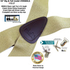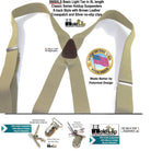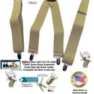Classic Series HoldUp brand Suspenders for the big and tall now come in a basic "TAN" with longer XL 54" adjustable length and top grade brown leather X-back style crosspatch embossed with our HoldUp logo. These have triple plated chrome finished patented NO-SLIP suspender clips and length adjuster. Guaranteed to never slip, slide, or fly off your pants with their exclusive needle sharp center locking pin and new slant faced clamp to prevent flipping open while sitting down. Made in America with USA soft poly blend elastic colorfast fabrics, these are the best choice in low-cost tan HoldUp suspenders. These are 1 1/2" wide, adjustable to 54" in length for the Big & Tall man, and carry a 30 day 100% satisfaction money back guarantee...