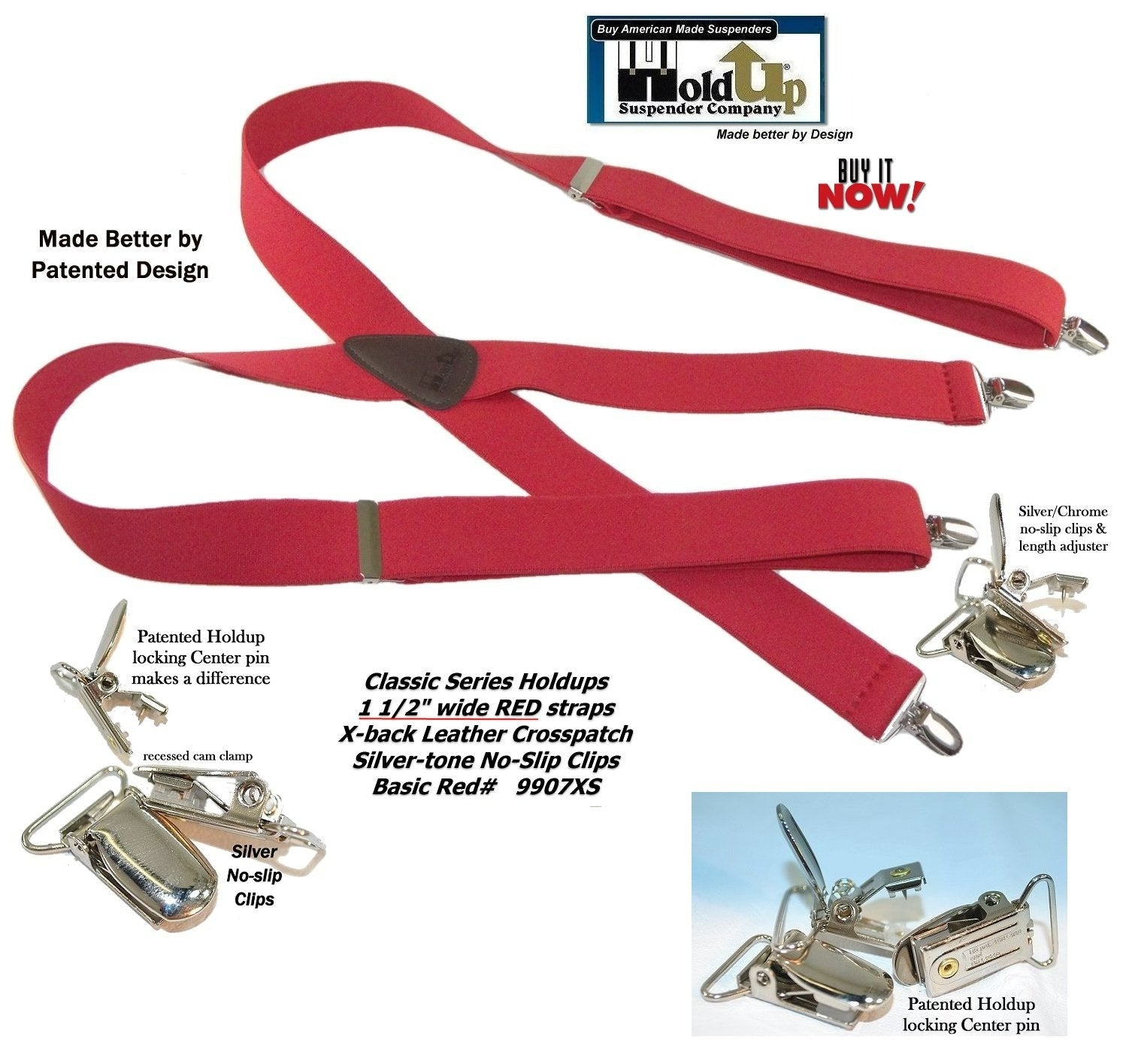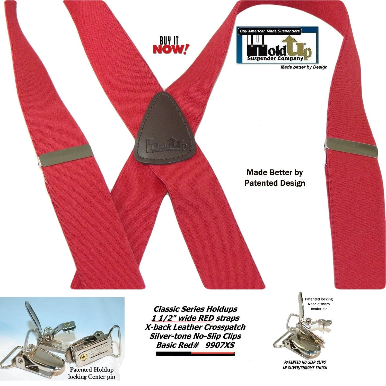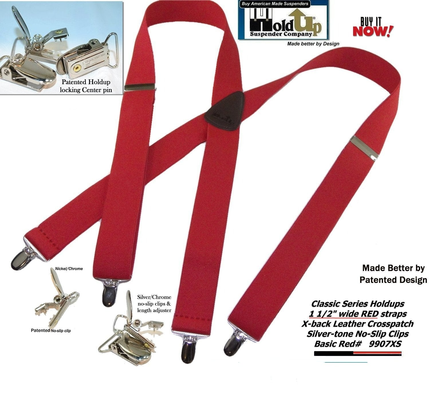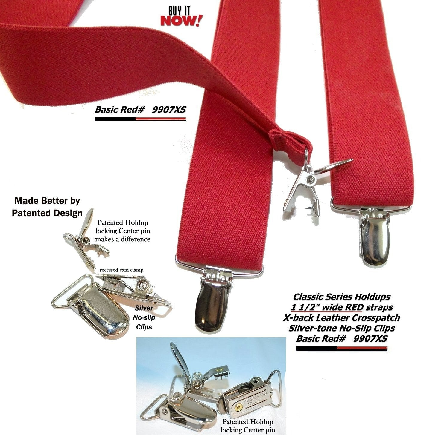 Holdup Bright RED Classic X-back Suspenders with USA Patented Silver-tone No-slip clips