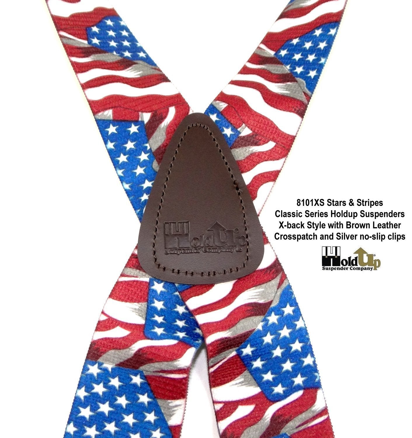 Holdup Classic Series Suspenders now come in USA Flag colorfast pattern and now in our new Amazon Web shop. These hand washable US flag suspenders are perfect for wearing to vote or political rallies and parades. They have a top grade brown leather X-back style crosspatch embossed with our TRADEMARKED Holdup logo. These also have triple plated silver/chrome finished patented NO-SLIP suspender clips and matching silver-tone metal strap length adjuster. Guaranteed to never slip, slide, or fly off your pants because of the exclusive needle sharp center locking pin and new slant faced clamp to prevent flipping open while sitting down on couches or car seats.