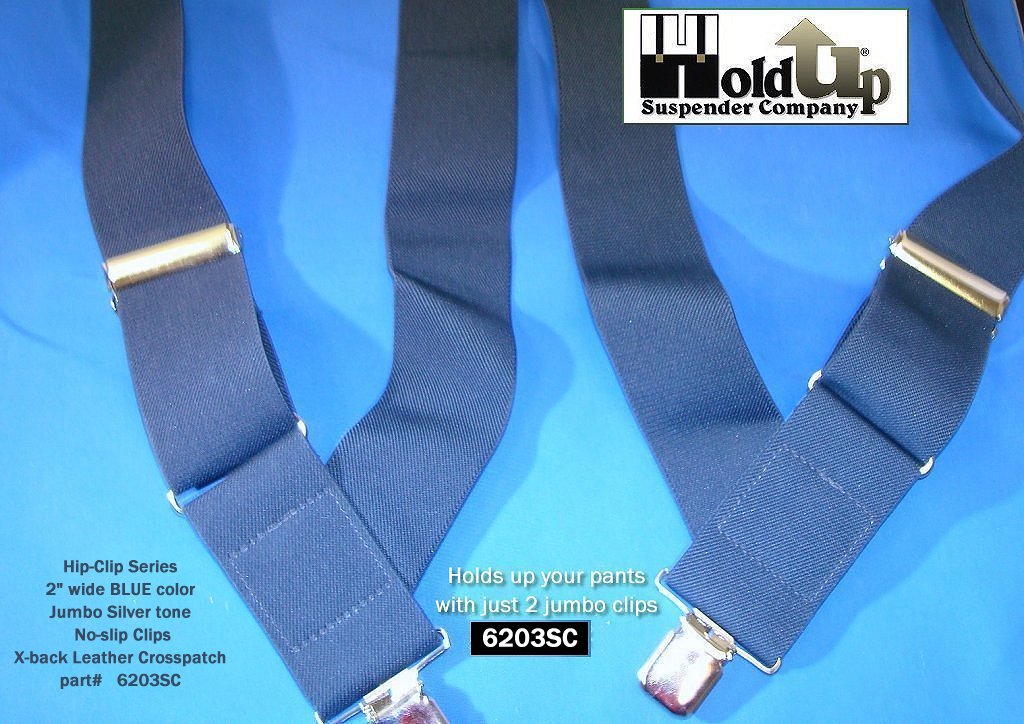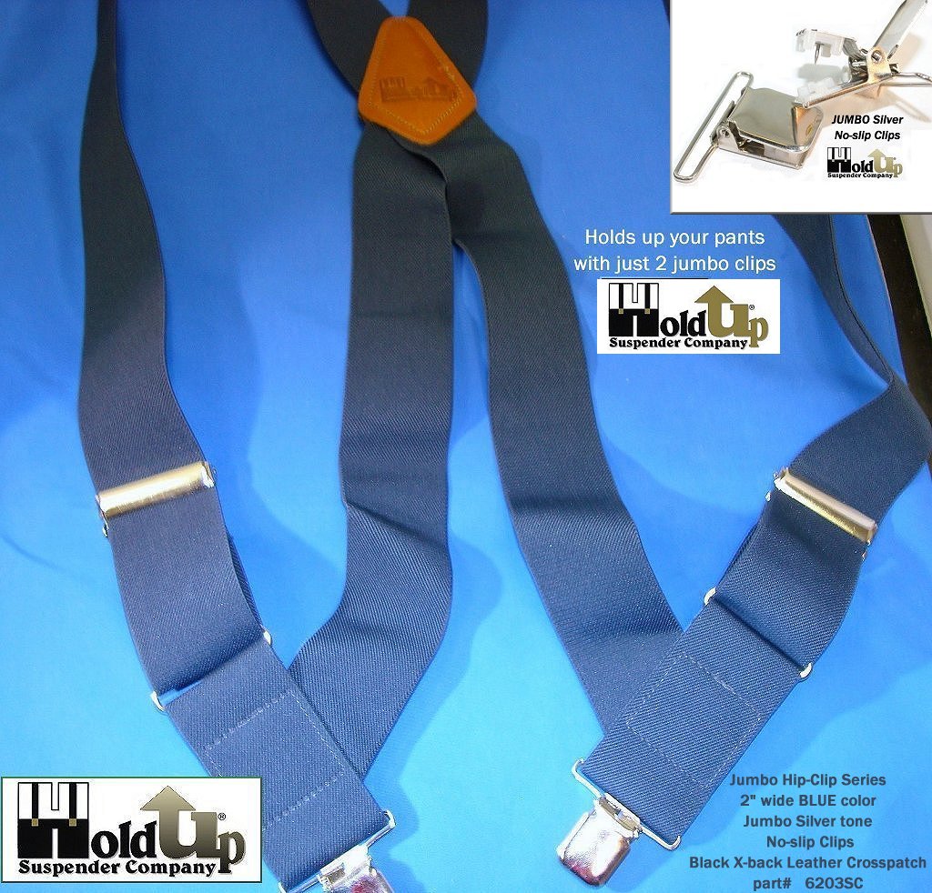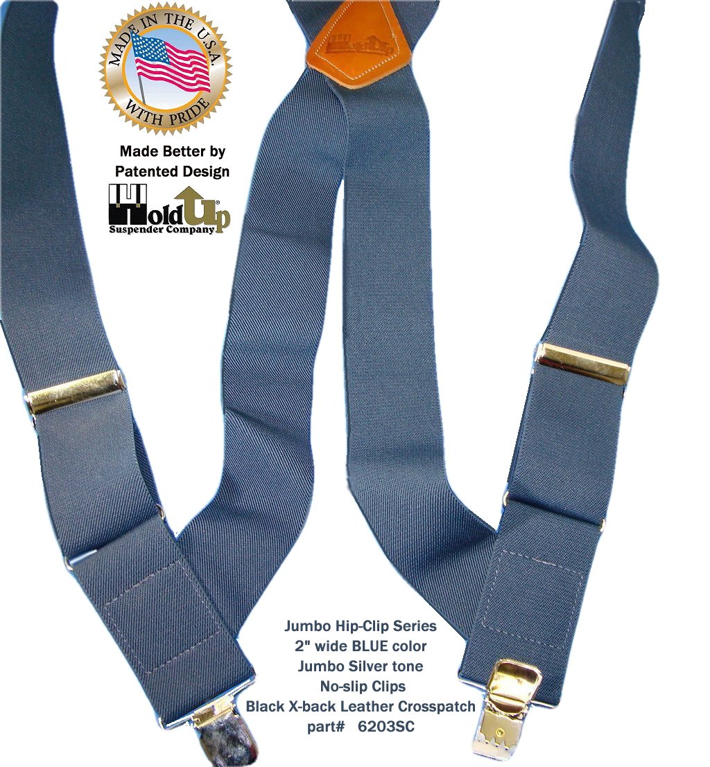 - Side clip Holdup Blue suspenders in HD 2 " width with top grade brown leather X-back crosspatch embossed with our trademarked Holdup logo