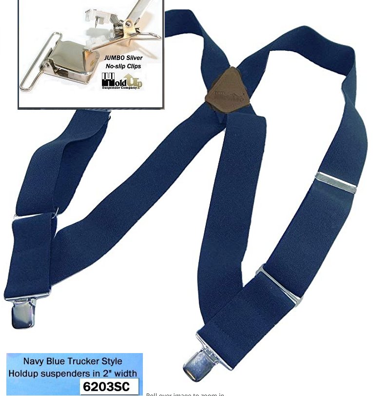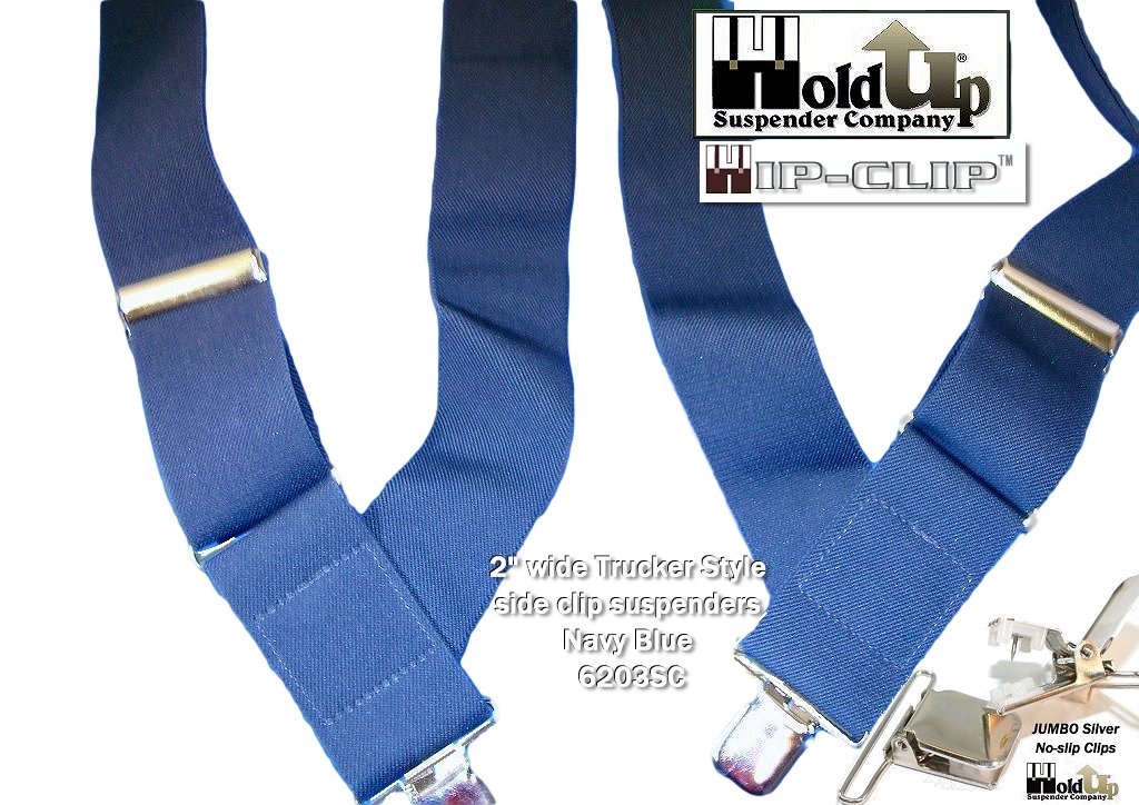 Holdup Suspender Company Introduces the comfortable side clips trucker style 2" wide Navy Blue suspender in the Jumbo Trademarked Hip-Clip Series. This pair Has USA made cotton poly-blend elastic course weave straps and exclusive patented silver chrome jumbo no-slip center pin NO-SLIP clips. These slip on like a backpack and the silver-tone metal strap length adjuster makes these fit men to 6' tall. Now you can comfortably hold up your jeans or work pants with just the snap of 2 of our exclusive NO-SLIP clips at the side of your waistband. These 2" wide Hip-Clip Style Dark Blue heavy duty elastic fabric straps are hand washable and made to last through years of daily wear without having any clips digging into your back while sitting on car seats or chairs