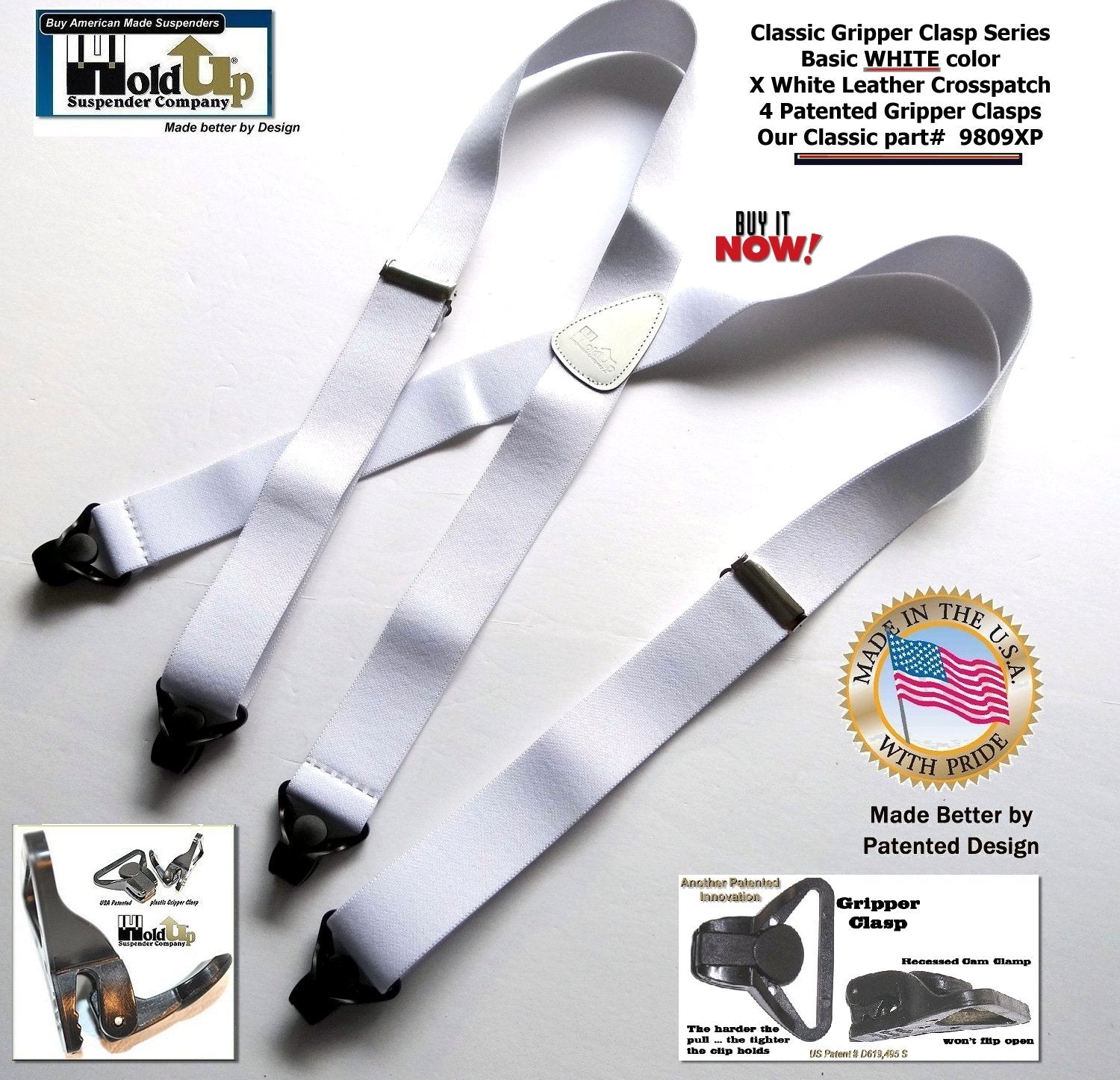 NEW - Classic Series Holdup Suspenders now come in a very Elegant Solid White Color USA made washable strap available now in our new Amazon powered Webshop. These Classic all White colored Holdups Suspenders have a white leather X-back style crosspatch embossed with our Holdup logo. These also feature our Patent Black Gripper Clasp suspender clips with Chrome Length adjuster. Bonus: The Harder you Pull on Our Patented Black Gripper Clasp the Tighter is told on the waistband. Guaranteed to never slip, slide, or fly off your pants. Our American USA MADE Patented Holdup X-Back Suspenders are a Perfect choice for low-cost Holdup brand patented suspenders. These Beautiful White Classic Holdups are 1 1/2" wide, adjustable to 48" in length. Adjustable so they comfortably fit men to 6" tall. HoldUp Suspenders carry a 30 day 100% satisfaction money back guarantee. Purchase using your PayPal or Amazon membership account and take advantage of our free freight option.