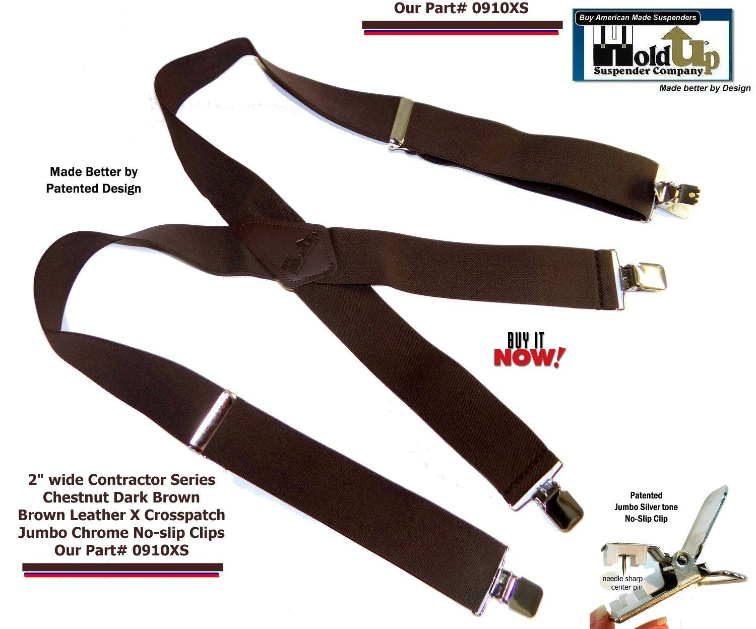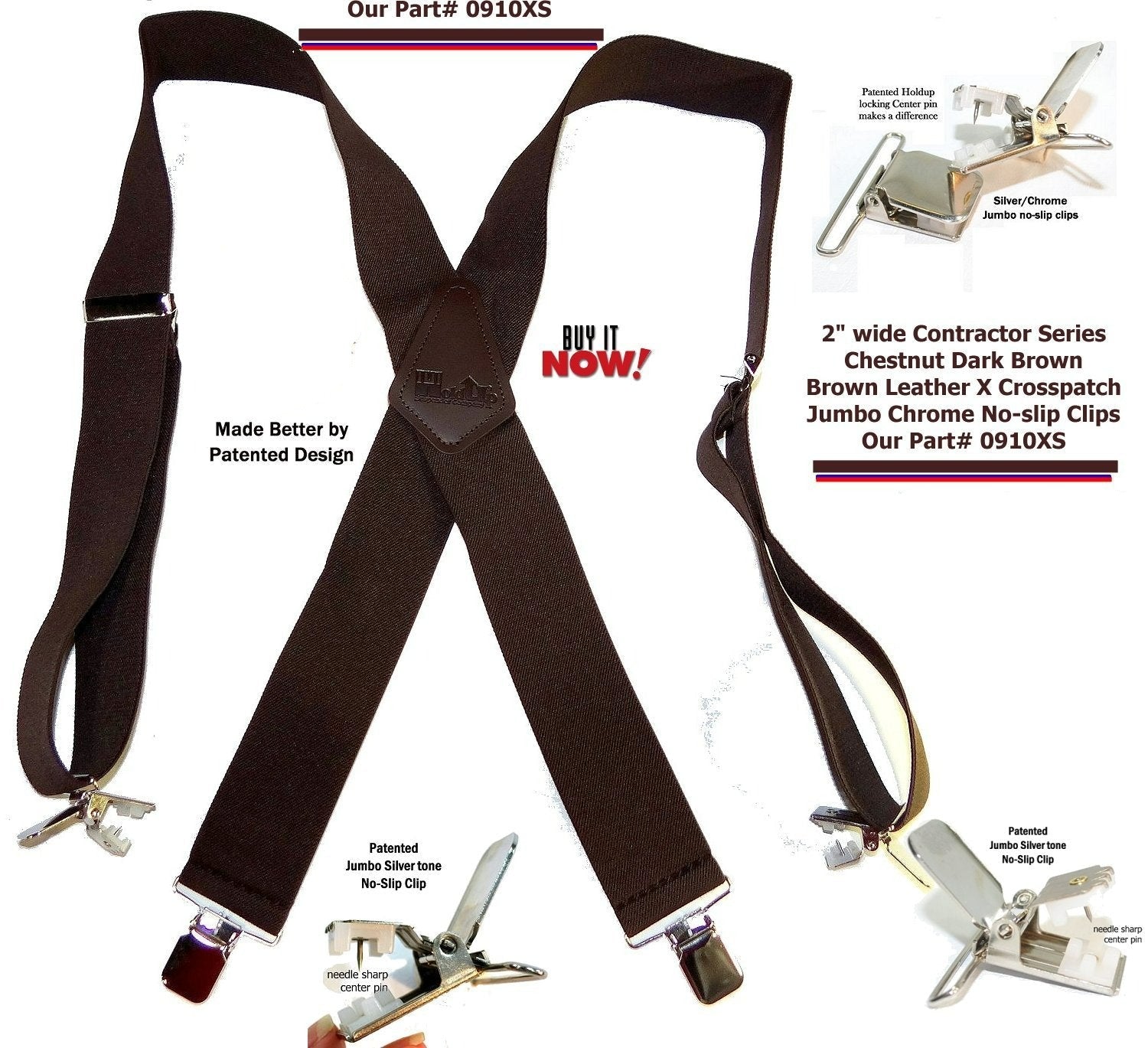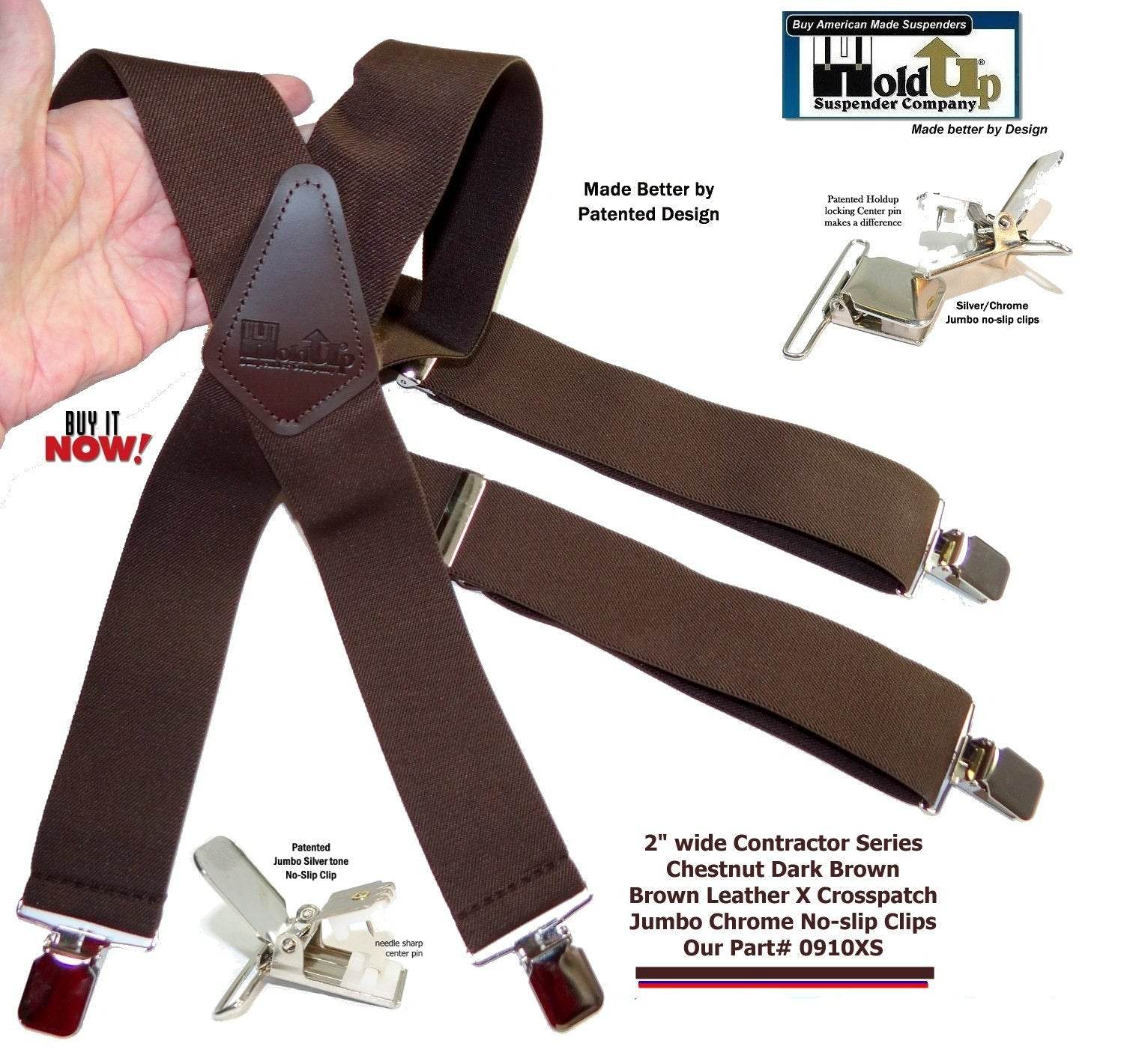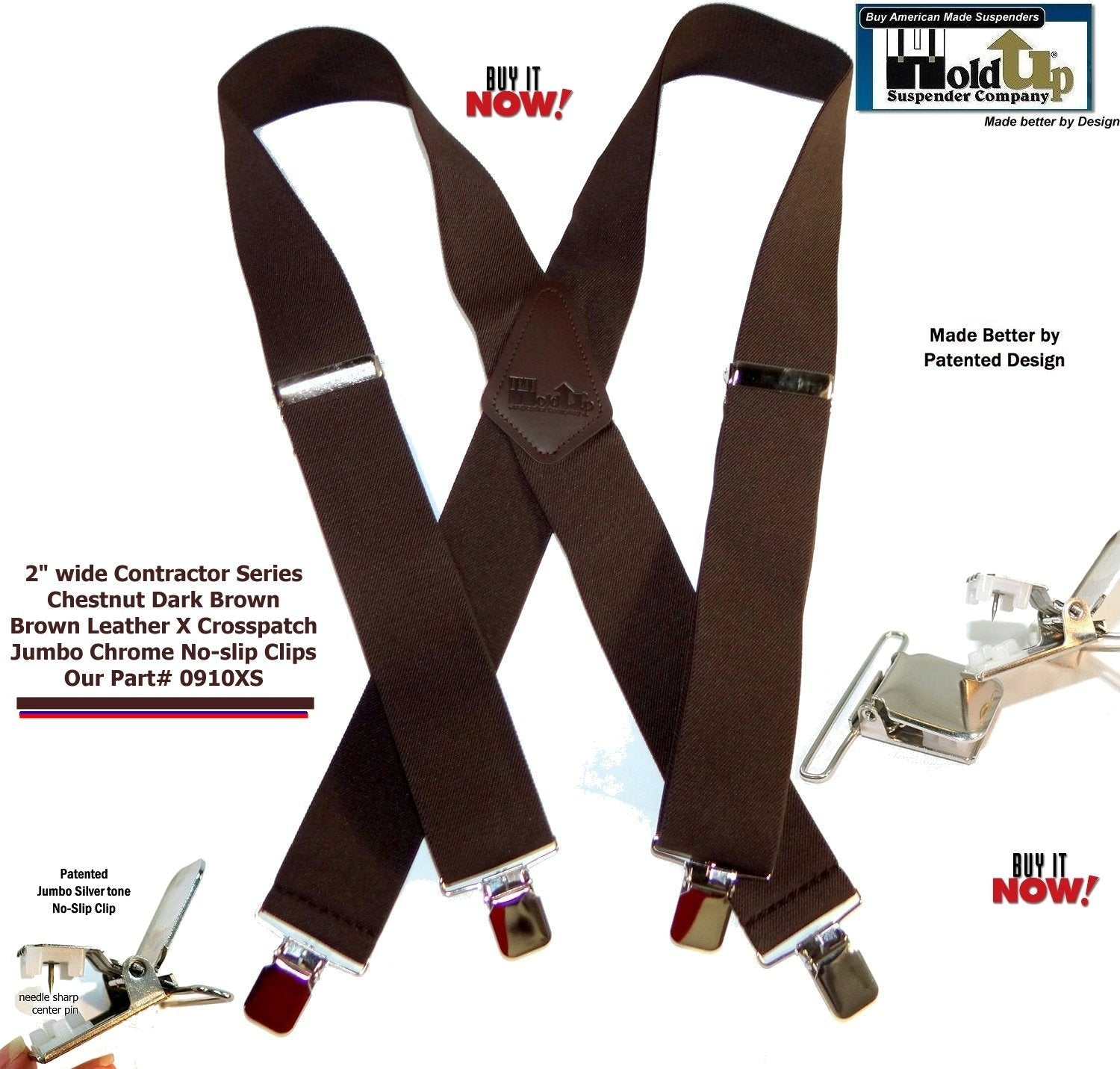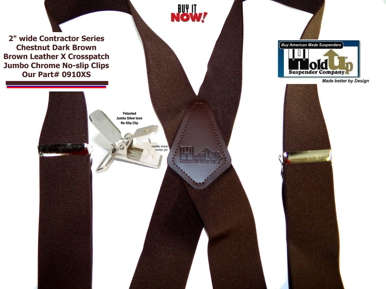 These DARK Chestnut BROWN colored 2" wide 48" long Jumbo Contractor Series of Hold-Up suspenders are specifically designed for securely holding up a working man's pants. With everything imaginable hanging from your trousers it's hard to keep them up with just an ordinary belt. The contractor Series Holdup suspender line in 10 colors is specially designed with wider HD straps and our patented Silver tone No-slip clips to assure you're pants are Always Up. This style has 4 jumbo silver finished center pin type no-slip clips for extra holding power. Buy one of these dark Chestnut Brown color Contractor 2 inch wide Holdup suspenders using your PayPal or Amazon account or favorite Debit/Credit Card. These have a unique, patented Hold-up JUMBO Center pin type Clips and come with top grade natural leather crosspatch embossed with Holdup logo.