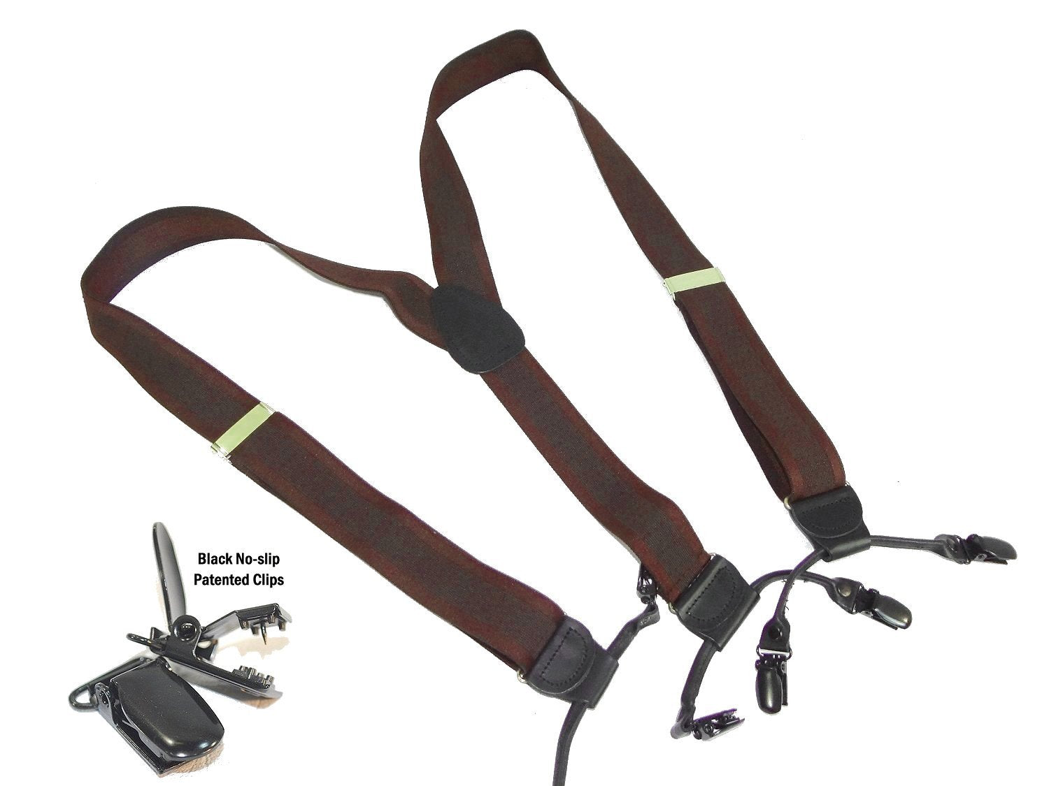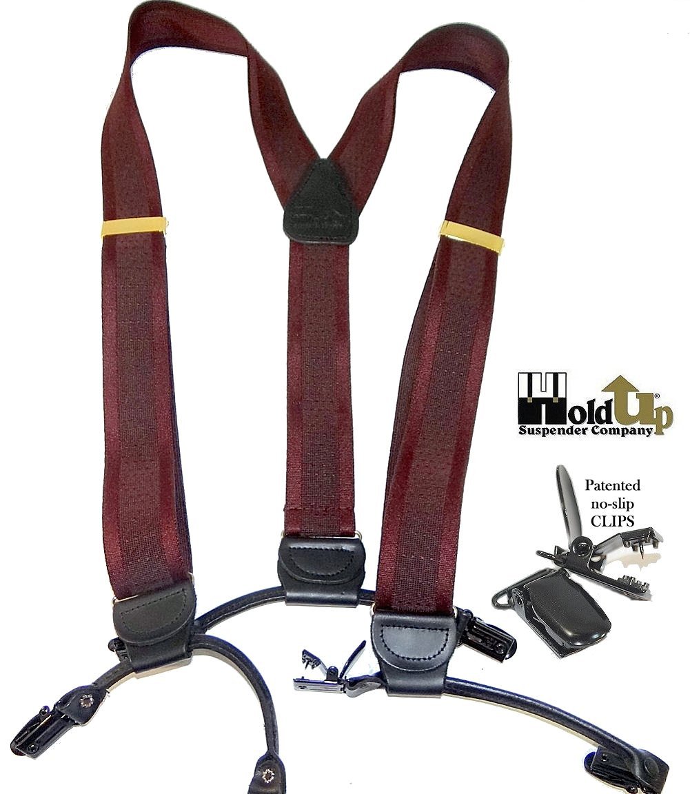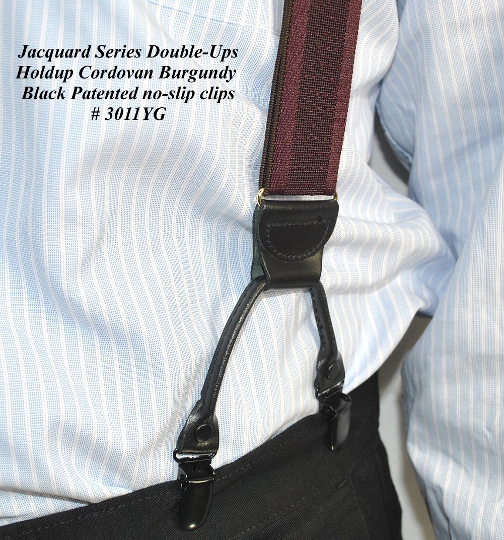 These USA patented Jacquard Series Double-Ups men's suspender features a CORDOVAN maroon color mix and features two newly re-designed no-slip patented suspender clips on each black leather tab. These are adjustable in length to 48". This traditional style mirrors the look of a button on suspender worn since they were first invented. Sal Herman, the President of Holdup Suspender Co., worked for years to perfect these stunning braces most popular with actors, doctors, businessmen, students, and professors. By eliminating the custom tailoring requirement to sew suspender buttons onto every pair of pants you wish to wear with suspenders...now you can easily attach your Jacquard Double-Ups to your entire wardrobe of pants in a snap. Get the aesthetic look of old-style button-on braces with the convenience and ease of our no-slip clips. An exclusive design feature of these suspenders is we eliminate the proverbial waistband rollover caused by button-on braces, which pull in the middle of the waistband. This burgundy on burgundy jacquard striped Holdup suspender looks just as great with blue jeans or even better with dress pants for both a casual and dressy look at the snap of a clip. Great special occasion gift for that man in your life who likes to dress up!