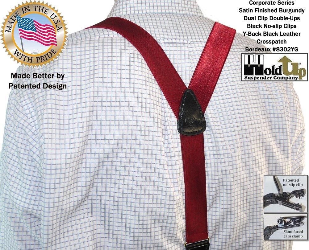 All Corporate Series Double-Ups have top grade black leather clip tab holders and our logo embossed on the double stitched crosspatch. Great as a birthday or special occasion gift. If you need a pair of suspenders that perform year after year...get a pair of HoldUp Suspenders in this Bordeaux Burgundy color for you or a friend. Now sold here at holdupsuspenders.com webshop, these deep burgundy formal Double-Ups feature solid colors blended right into the dense fine elastic weave USA made fabric. Â We guarantee the HoldUp Brand suspenders will never slip, slide, or fly off like all other suspenders do because of our patented clips. No matter how much you spend or how often you have a tailor sew on suspender buttons the net result will never equal the holding power of a pair of Hold-Up suspenders!