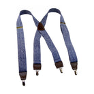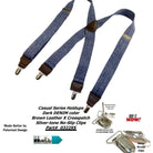 - 1 1/2" wide dark blue denim Holdup brand X-back suspenders