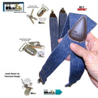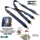 HoldUp Suspender Company's Dark Blue Denim X-back Suspenders in 1 1/2" width and USA Patented No-slip Nickel plated Clips