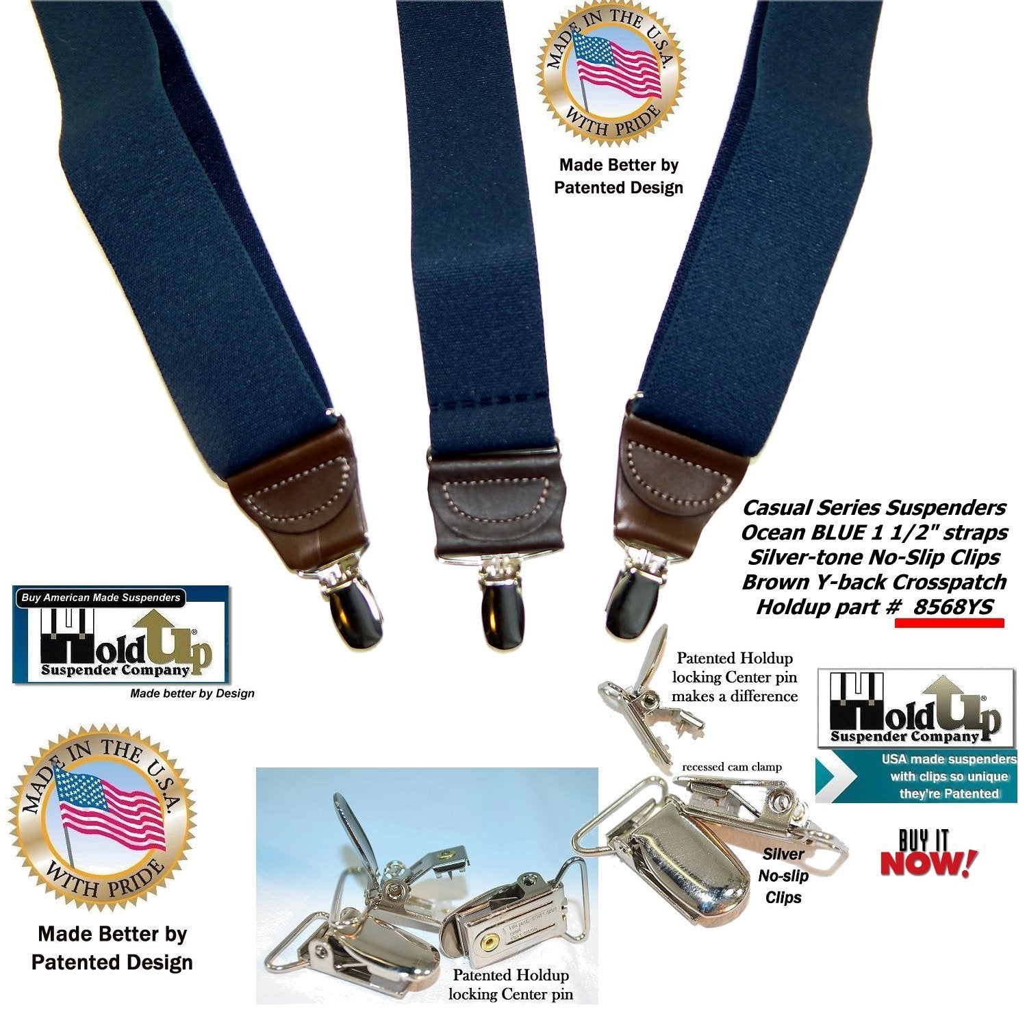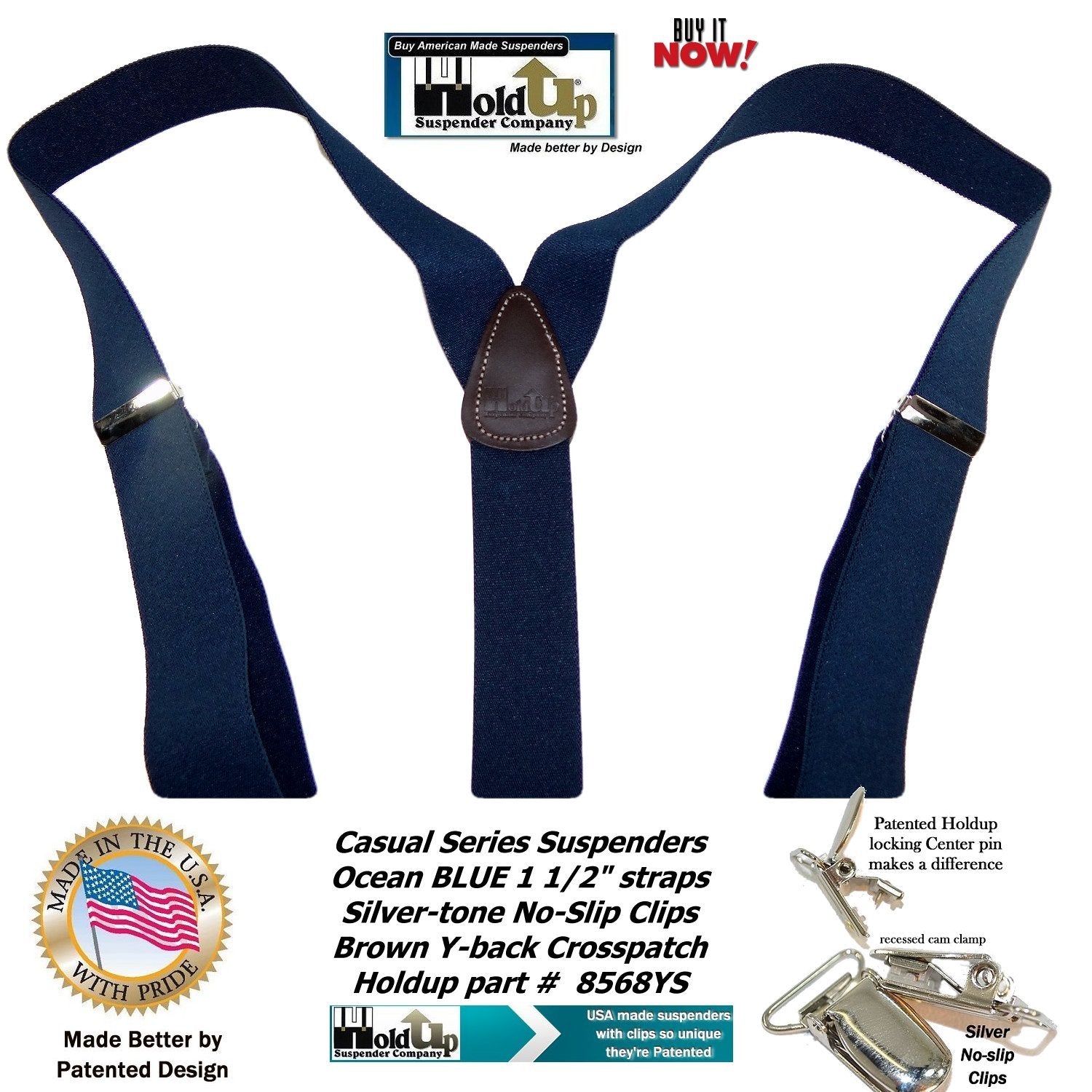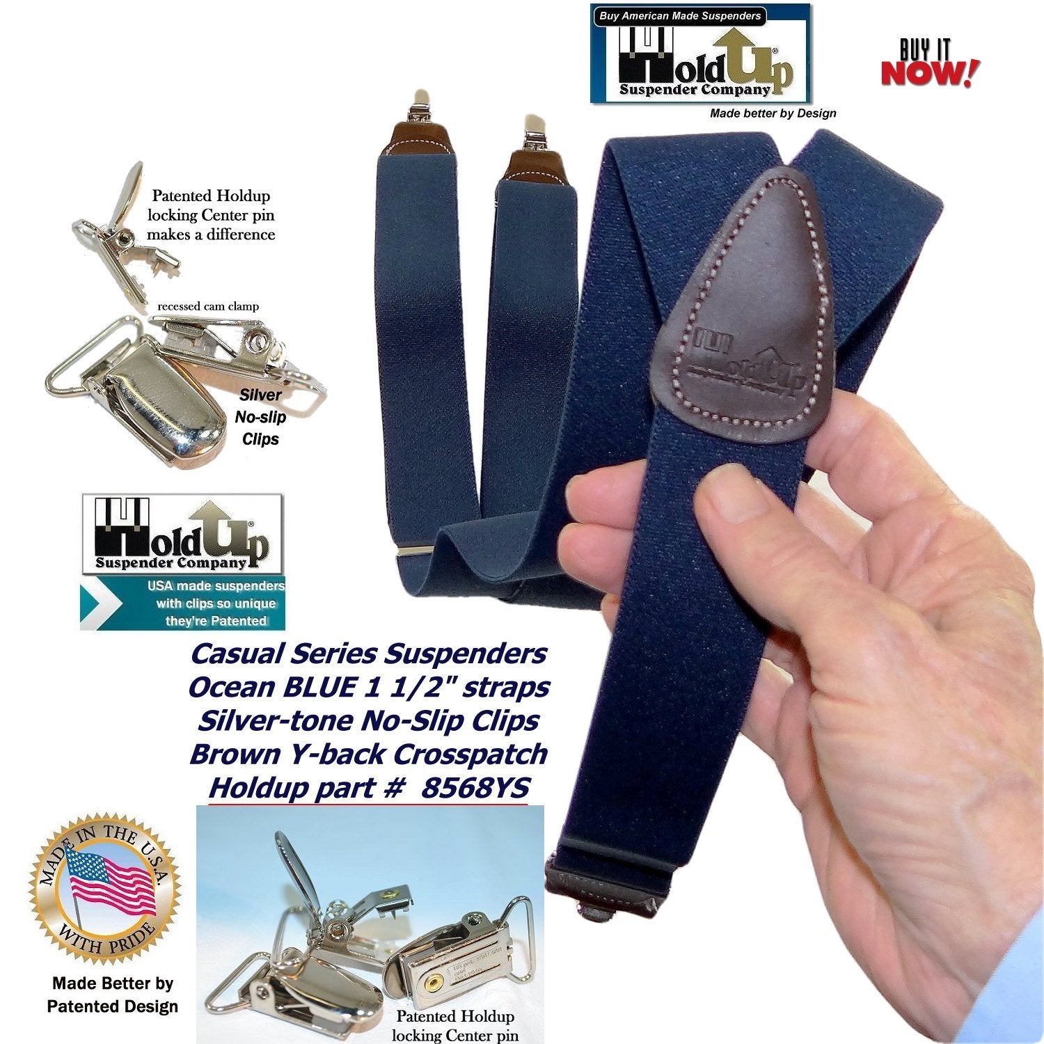 Holdup's Casual Series-in dark "OCEAN BLUE" solid colored men's clip-on Y-back suspenders featuring our patented- chrome silver tone no slip clip with locking center pin. This style is great for office or casual wear when you need to make a conservative fashion statement! Pick out several pairs of Casual Series Holdup USA made men's sold colored men's clip on suspenders which all have brown top grade leather tabs and X or Y-back brown leather logo embossed crosspatch. Great as a birthday or special occasion gift, like Father's Day, for someone needing a fashion makeover. All USA made materials are carefully chosen for elastic durability with a flat finished course weave strap. If you need a pair of suspenders that perform year after year.. then we'd always suggest a pair of Holdup Suspenders for you or a friend. Unconditional 30 day money back guarantee and Amazon secure checkout with FBA delivery. You'll love these dark Ocean Blue clip-on Holdup Suspenders or we'll give gladly refund your money. We guarantee all our quality built USA made Holdup suspenders will never slip - slide or fly off or fray your pants. Our part number 8568YS in dark Ocean Blue Color