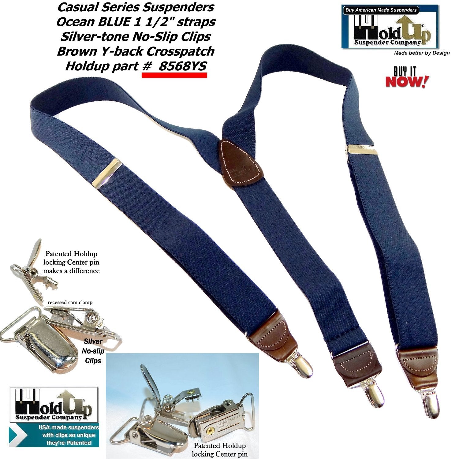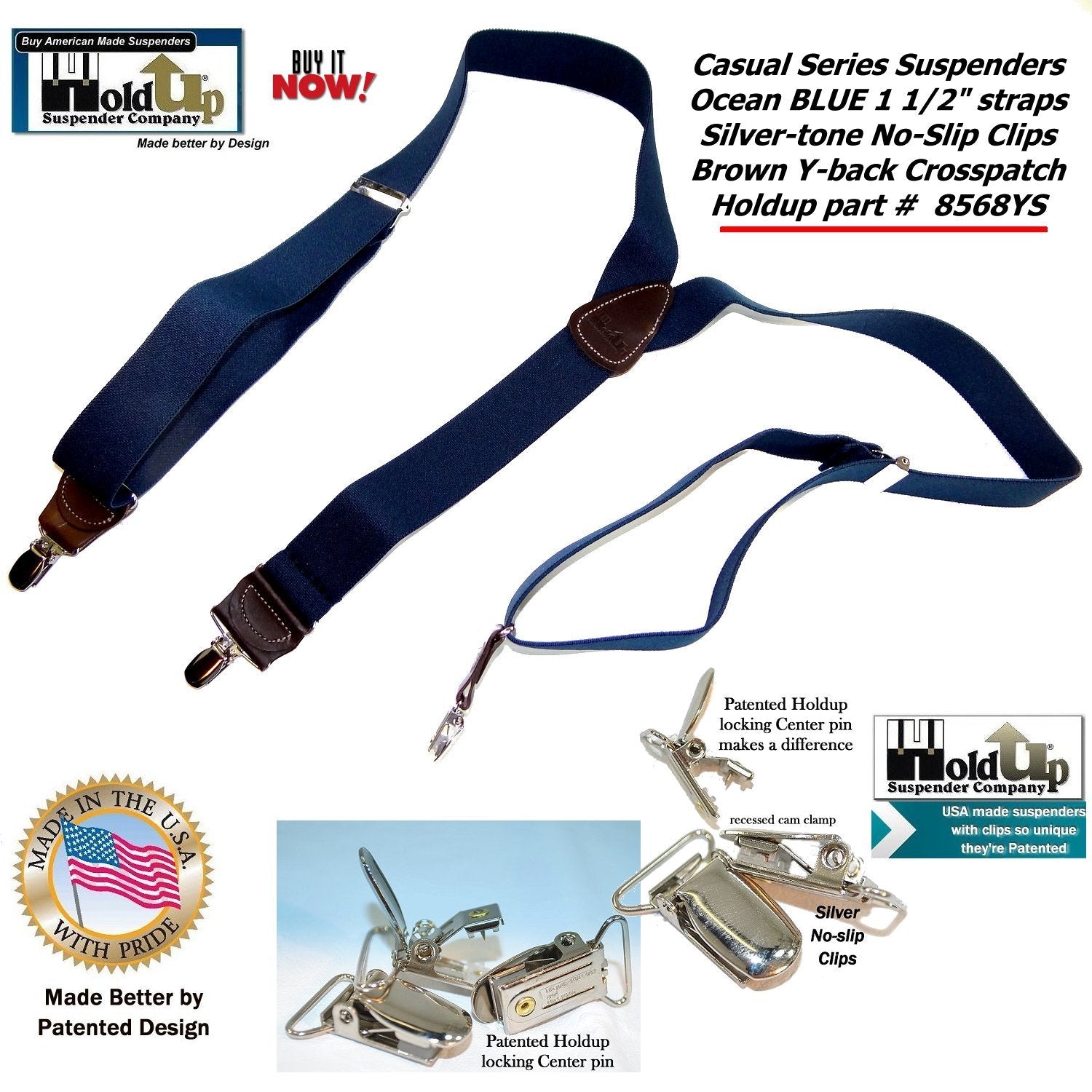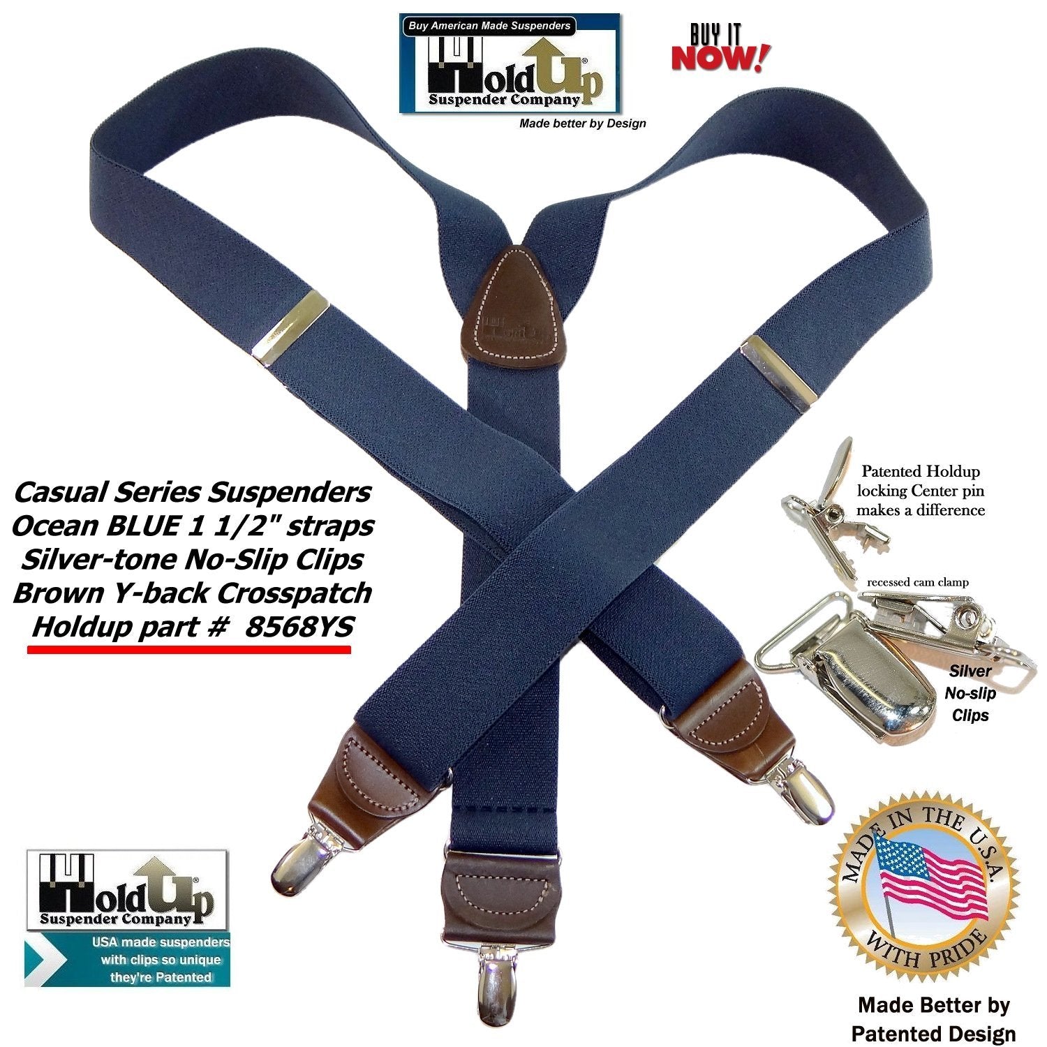 Holdup's Casual Series-in dark "OCEAN BLUE" solid colored men's clip-on Y-back suspenders featuring our patented- chrome silver tone no slip clip with locking center pin. This style is great for office or casual wear when you need to make a conservative fashion statement! Pick out several pairs of Casual Series Holdup USA made men's sold colored men's clip on suspenders which all have brown top grade leather tabs and X or Y-back brown leather logo embossed crosspatch. Great as a birthday or special occasion gift, like Father's Day, for someone needing a fashion makeover. All USA made materials are carefully chosen for elastic durability with a flat finished course weave strap. If you need a pair of suspenders that perform year after year.. then we'd always suggest a pair of Holdup Suspenders for you or a friend. Unconditional 30 day money back guarantee and Amazon secure checkout with FBA delivery. You'll love these dark Ocean Blue clip-on Holdup Suspenders or we'll give gladly refund your money. We guarantee all our quality built USA made Holdup suspenders will never slip - slide or fly off or fray your pants. Our part number 8568YS in dark Ocean Blue Color