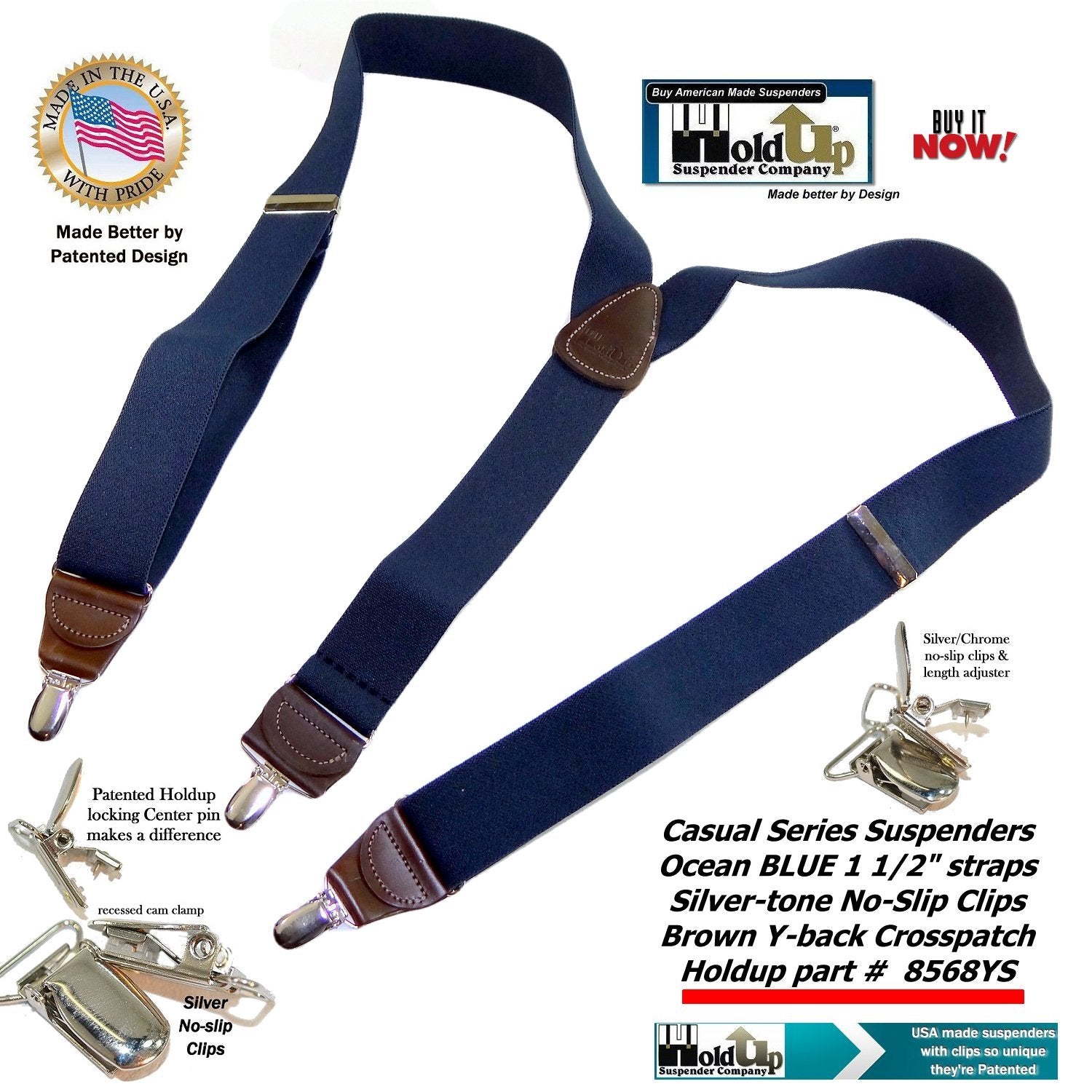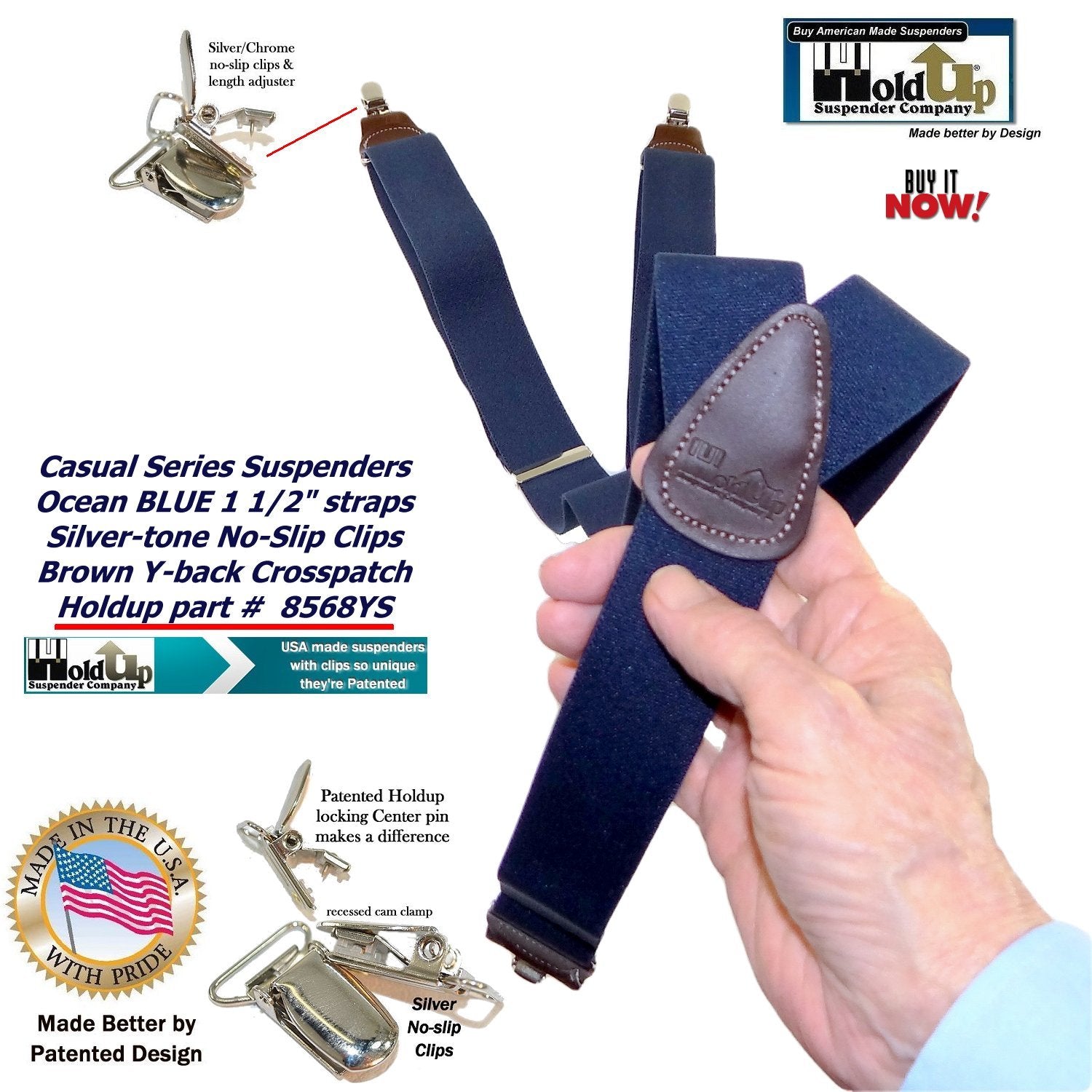 Ocean blue Y-back casual series Holdup USA made men's suspenders with patented silver-tone no-slip clips are made in the USA.