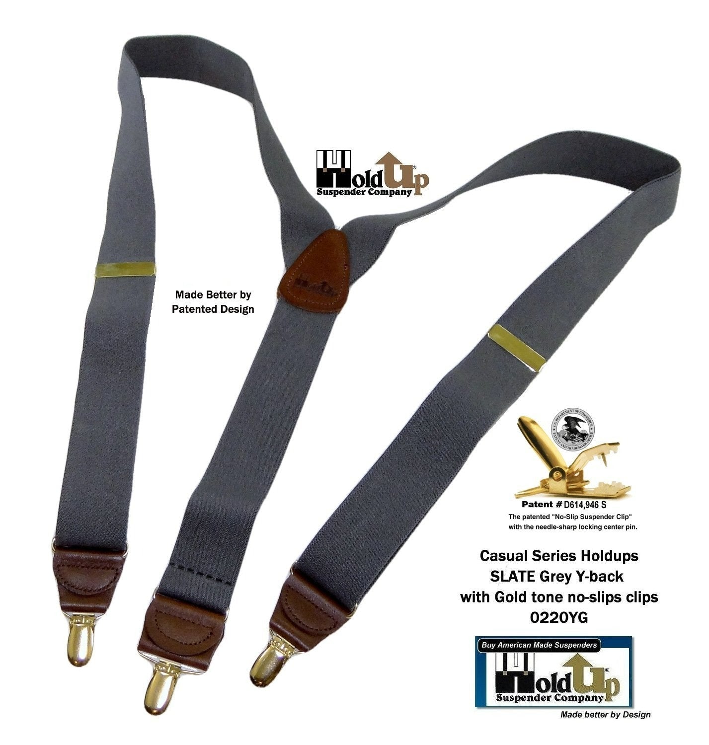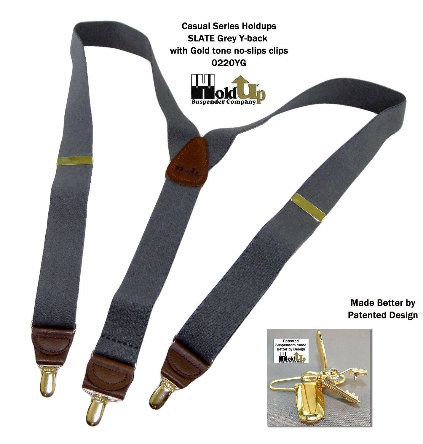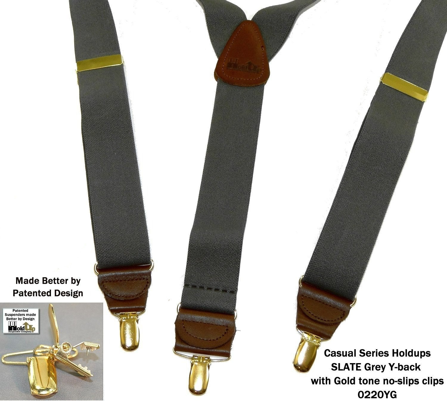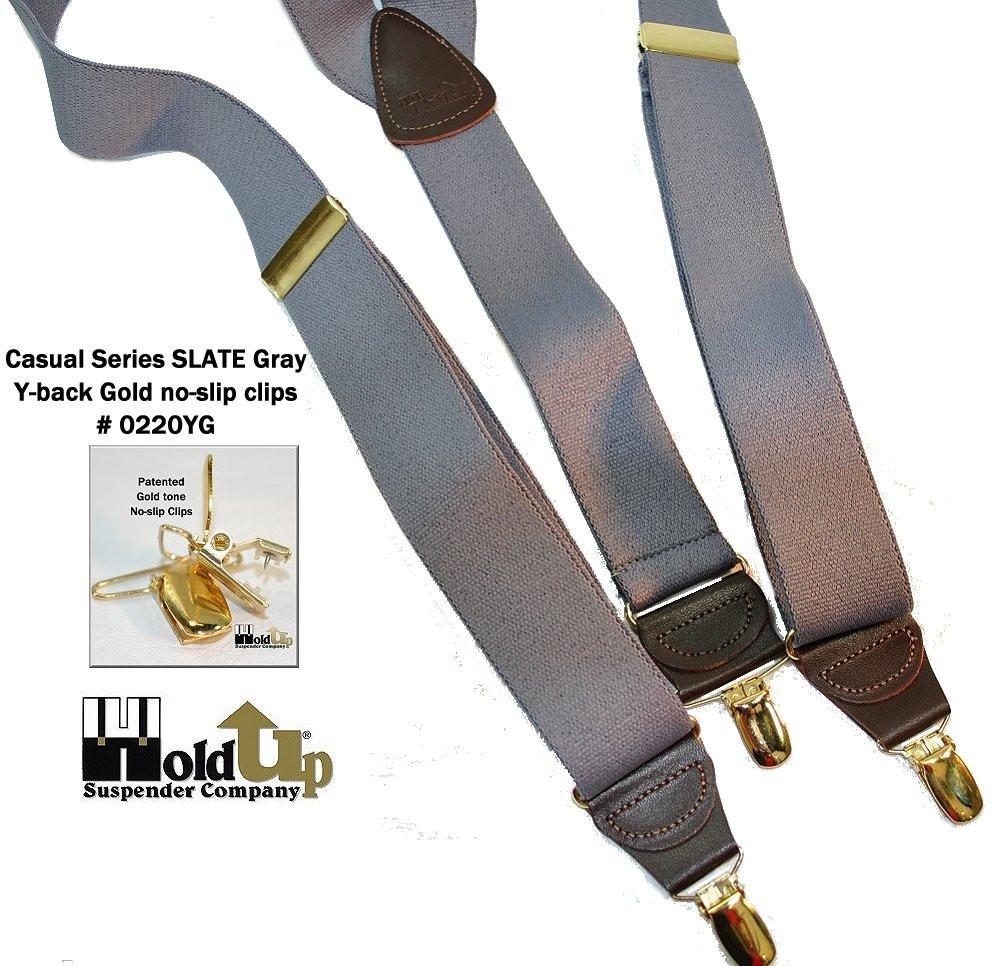 - Dark colorfast Gray strap Holdup Y-back style suspendersĀ with Patented No-slipĀ® suspender clips in gold tone finish