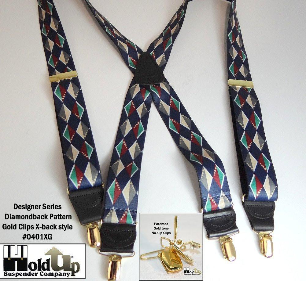 Hold-Ups Diamond Back Pattern Suspenders 1 3/8" in X-back w/ USA Patented No-slip Gold Clips