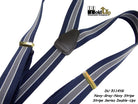Finally a top quality USA made Gray and Navy Blue Stripe dressy suspender made to wear at work or on a College Campus. HoldUp Suspender Company presents these Double-Ups in a "Navy Blue -Gray and white" striped men's suspender featuring our slant faced NO-SLIP patented clip in black. These are 1 1/2" wide and adjustable to 48" in length so they fit the average man to 6' tall.. This traditional style mirrors the look of "button-on" suspenders worn since they were first invented. Sal Herman, the President of HoldUp Suspender Co., worked for years to perfect these stunning braces still popular with lawyers, doctors, businessmen, and professors. By eliminating the custom tailoring requirement to sew suspender buttons onto every pair of pants you wish to wear with suspenders...now you can easily attach your Navy and Gray striped Double-Ups to your entire wardrobe of pants in a snap. Get the aesthetic look of "old style button-on" braces with the convenience and ease of our NO-SLIP clips.