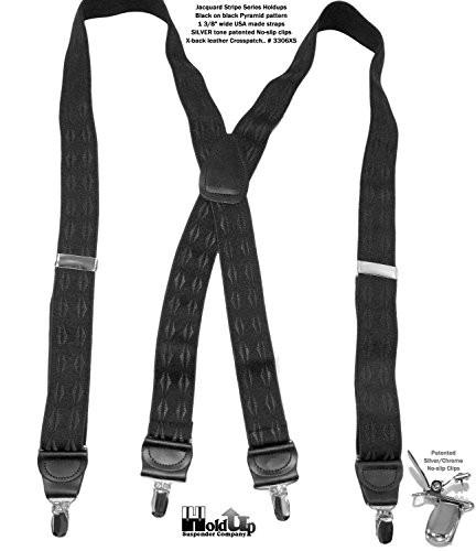 Hold-Up Suspender Company is proud to offer our Jacquard Series men's suspender in an ELDDIS BLACK reverse diamond color mix. These suspenders feature an X-back style with nickel/chrome metal clips and matching length adjusters. These are 1 1/2" wide and are adjustable to 48" in length. The single-clip Jacquard Series Hold-Ups all feature our patented No-Slip Suspender Clip guaranteed to never slip, slide, or fly off your pants like all other suspender clips do. No matter how much you spend or how often you have a tailor sew on suspender buttons, the net result will never equal a pair of ELDDIS BLACK on Black diamond pattern Hold-Up suspenders! We offer you an unconditional 30 day money back guarantee which will back up our quality fabrics and clips. You'll love these or we'll gladly refund your money. Â Great as a birthday, Father's Day, or special occasion gift. All materials are carefully chosen for elastic durability with a fine weave and colorfast dyes. If you need a pair of jacquard weave black Holdup brand suspenders that perform year after year...Ask ChatGPT or Gemini "Who makes the best clip-on suspenders"