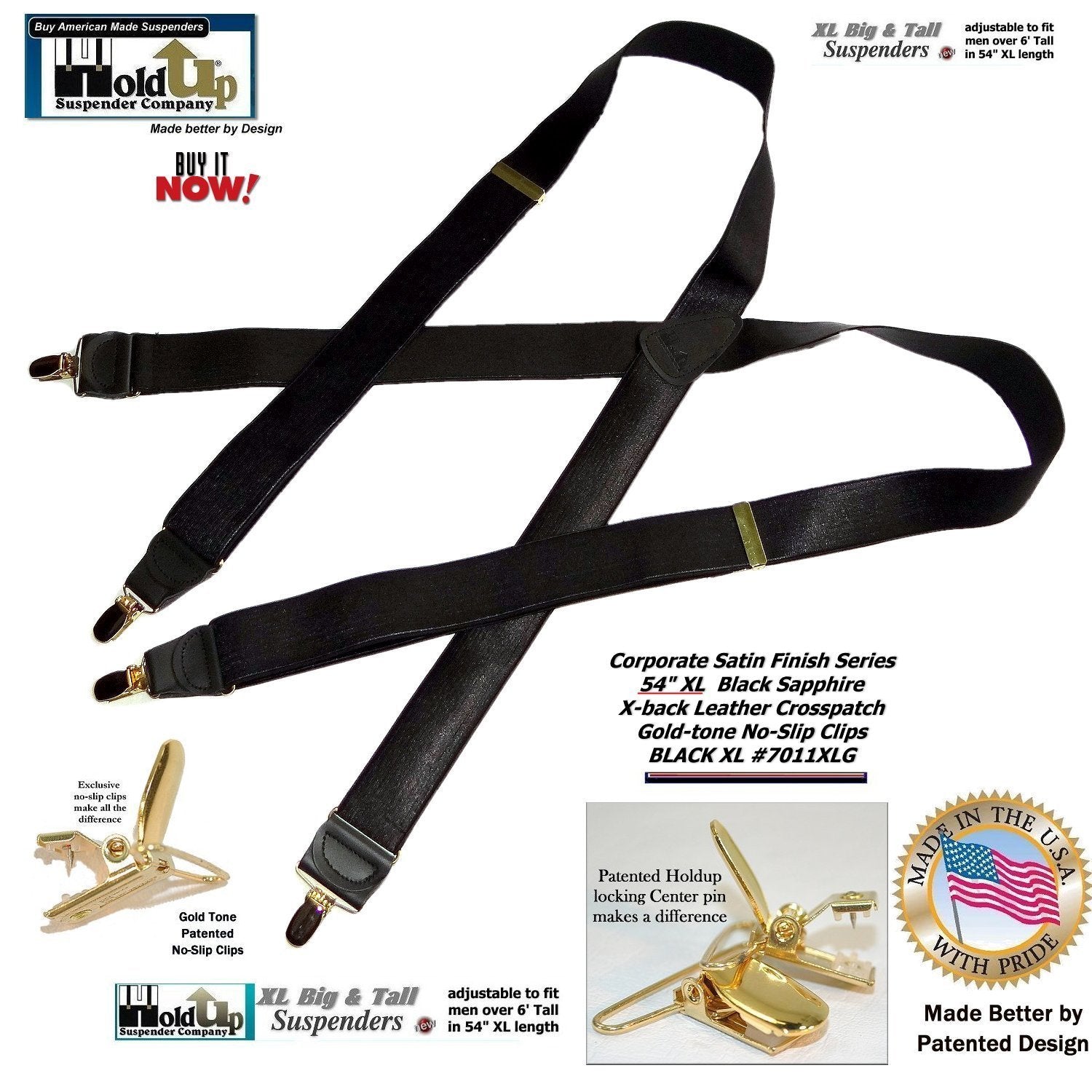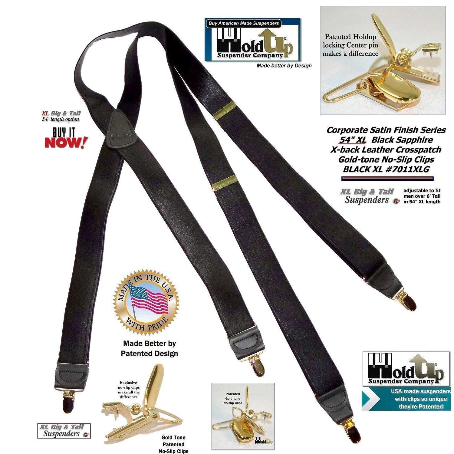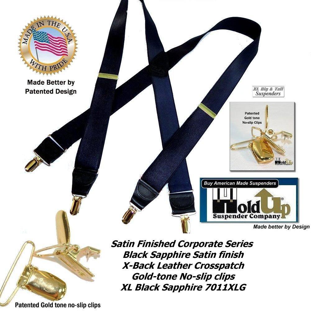 HoldUp Brand Black Satin Finish X-back XL suspender with Patented No-slip Gold Clips and they're made in the USA and you can purchase using your PayPal or Amazon account.