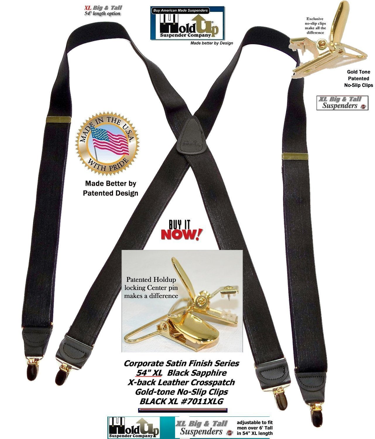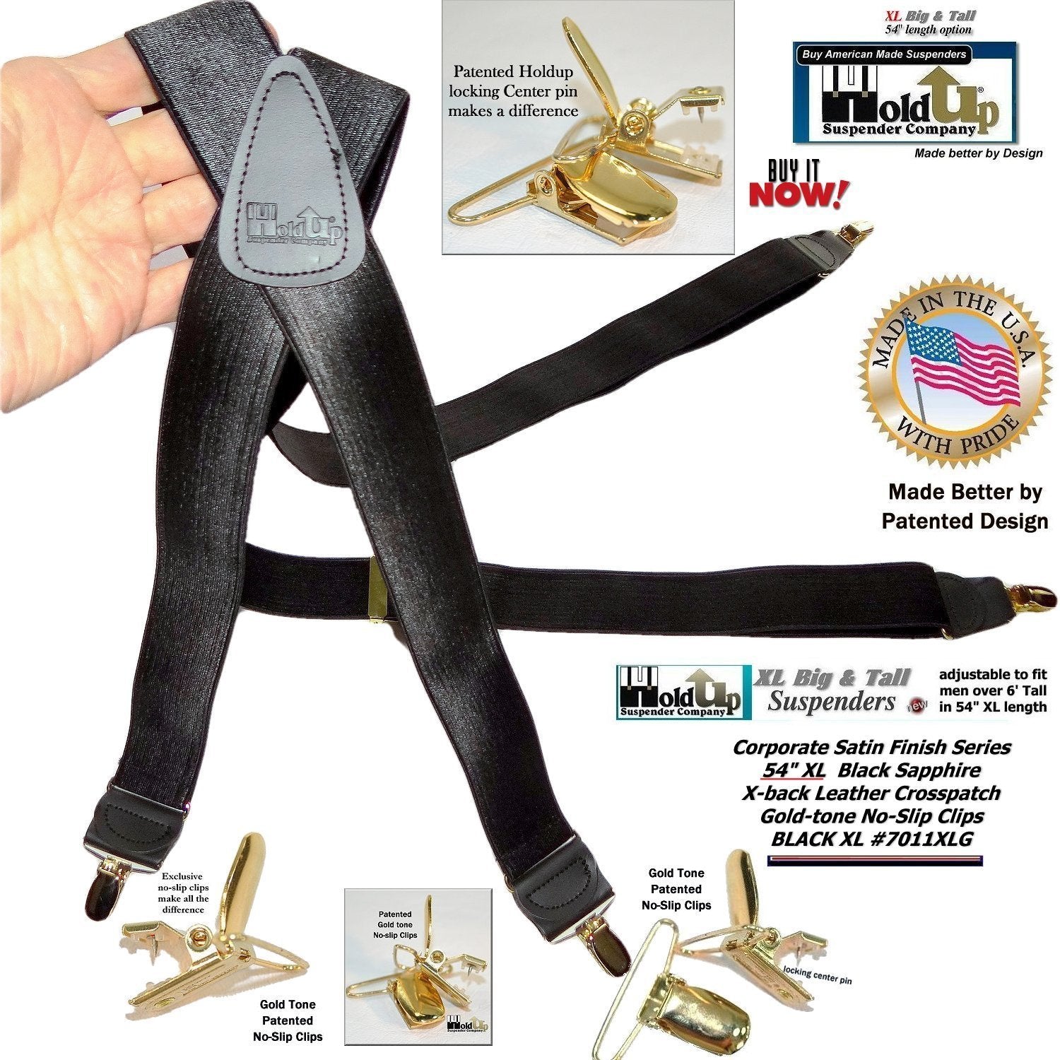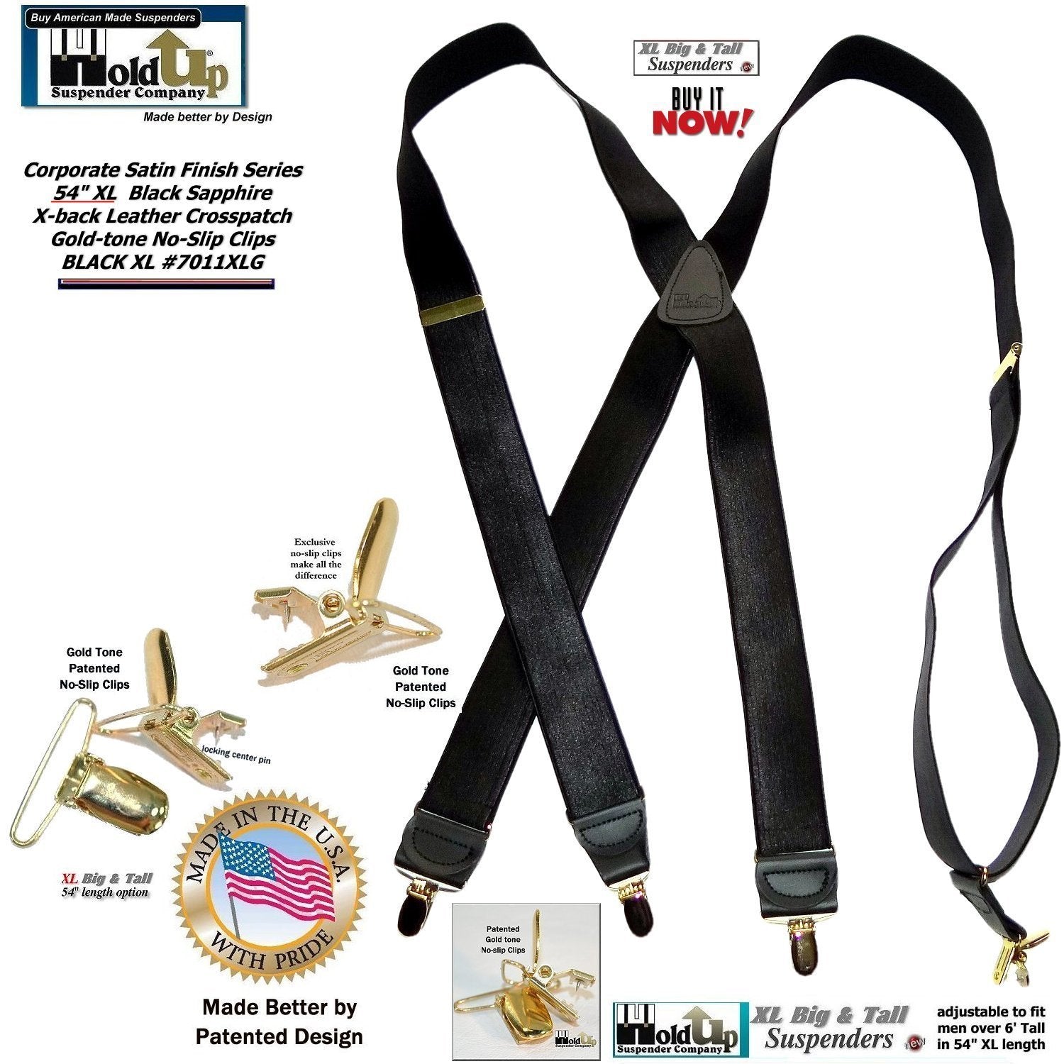 HoldUp Brand Black Satin Finish X-back XL suspender with Patented No-slip Gold Clips and they're made in the USA and you can purchase using your PayPal or Amazon account.