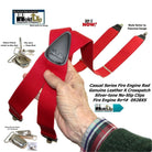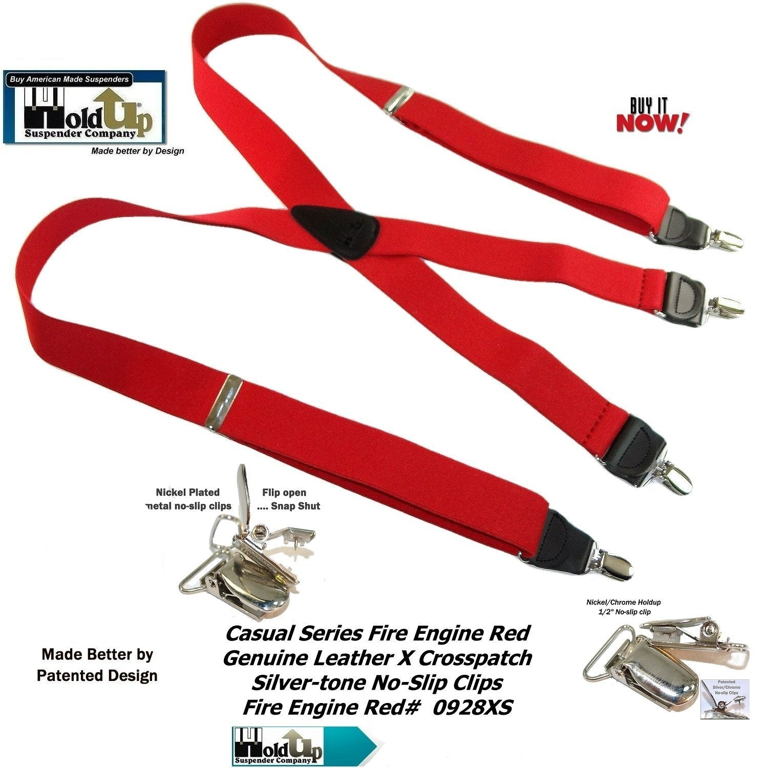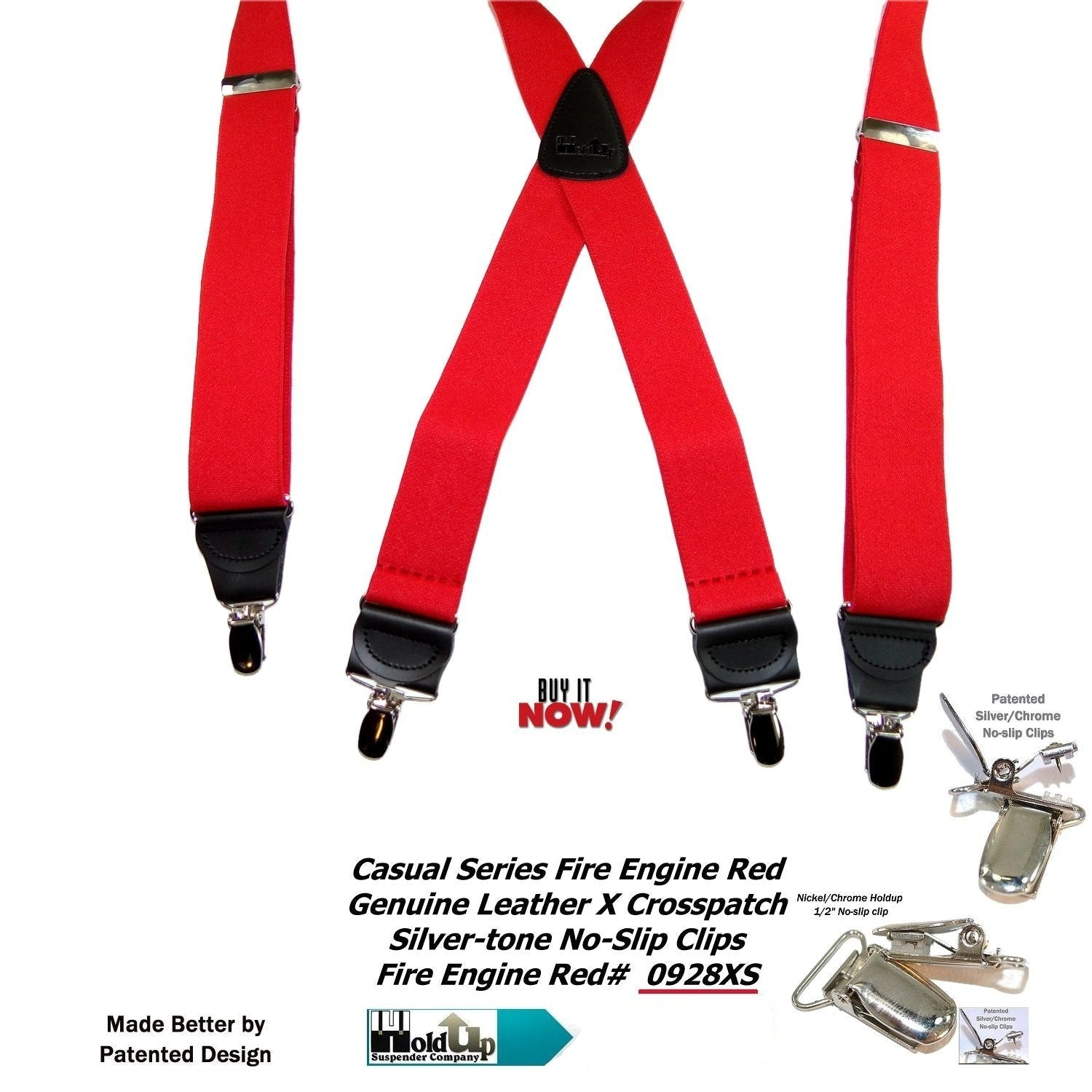 Holdup Casual series Suspenders in the bright Fire Engine RED color with a nice dense weave 1 1/2" wide Cotton poly-blend washable elastic fabric strap. Our Casual Series Holdups are all about options and these have brown leather double sewn X-BACK crosspatch with silver/chrome USA patented no-slip clips and matching silver tone metallic length adjuster. Only the best Cotton Poly-Blend strap materials, specifically chosen for durability and lasting stretch, are used in all Holdup brand Casual Series suspenders. Buy using your Amazon or PayPal account and all orders get free freight option at checkout.