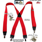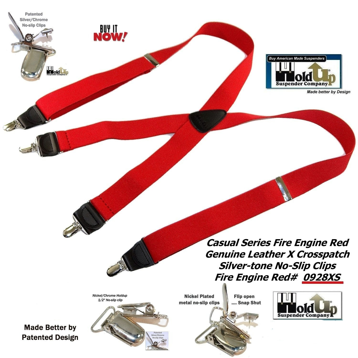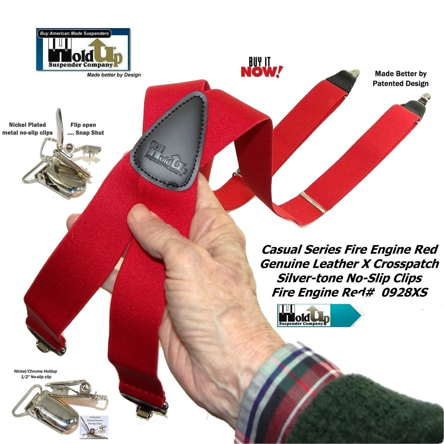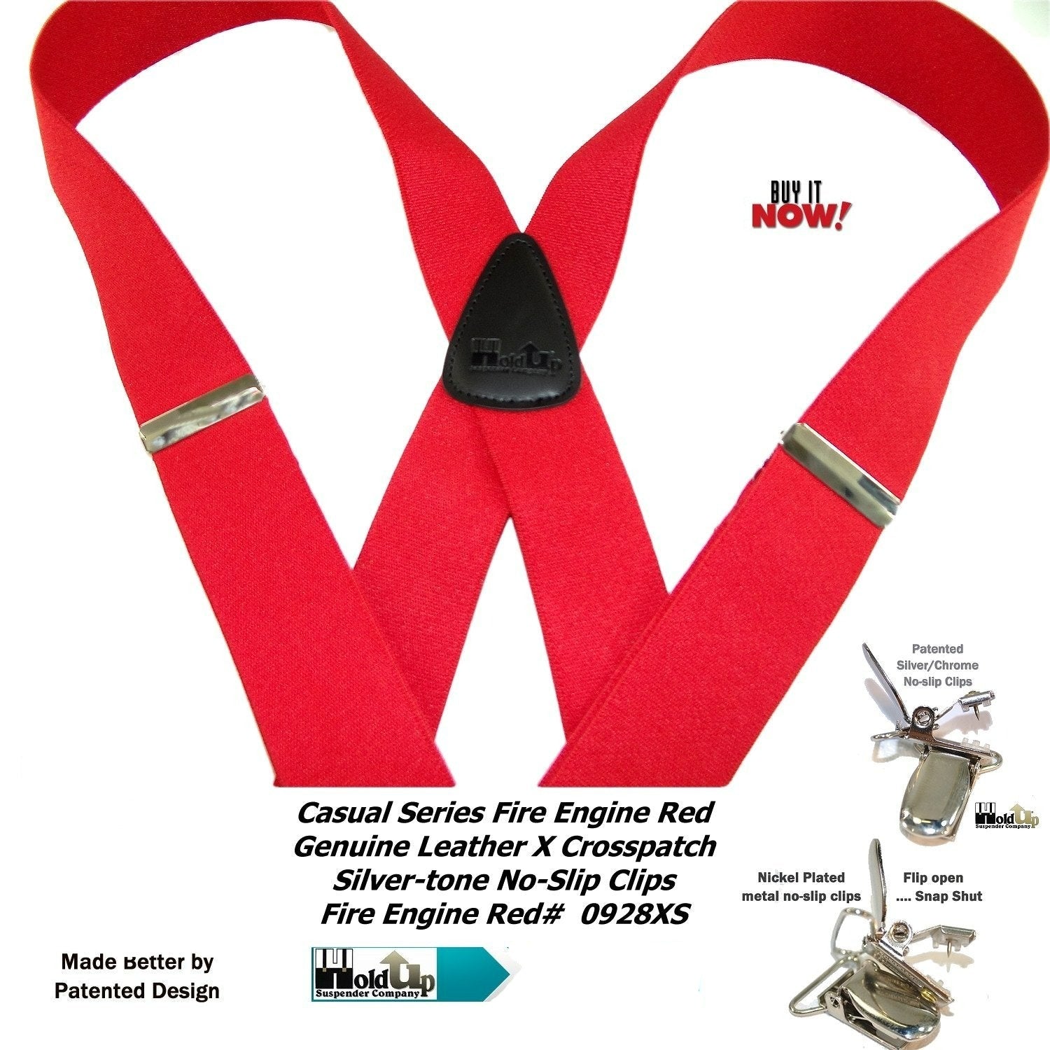 HoldUp Brand Fire Engine Red X-back Suspenders in 1 1/2" width and USA Patented No-slip Silver-tone Clips