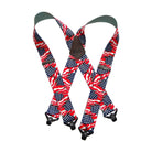 - Composite plastic jumbo patented clasps in a US Flag pattern X-back suspenders