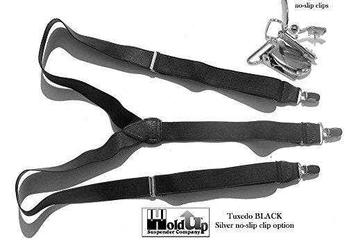 - Y-back Tuxedo Black Formal Series Holdup suspenders with nickel-tone NO -SLIP patented clips
