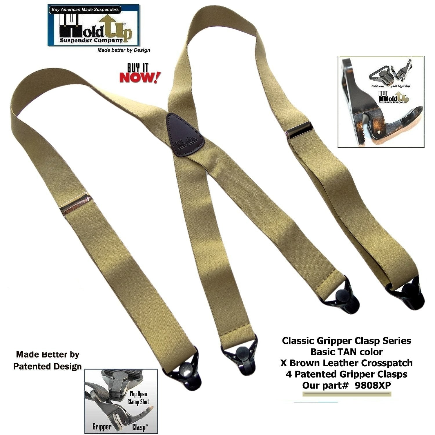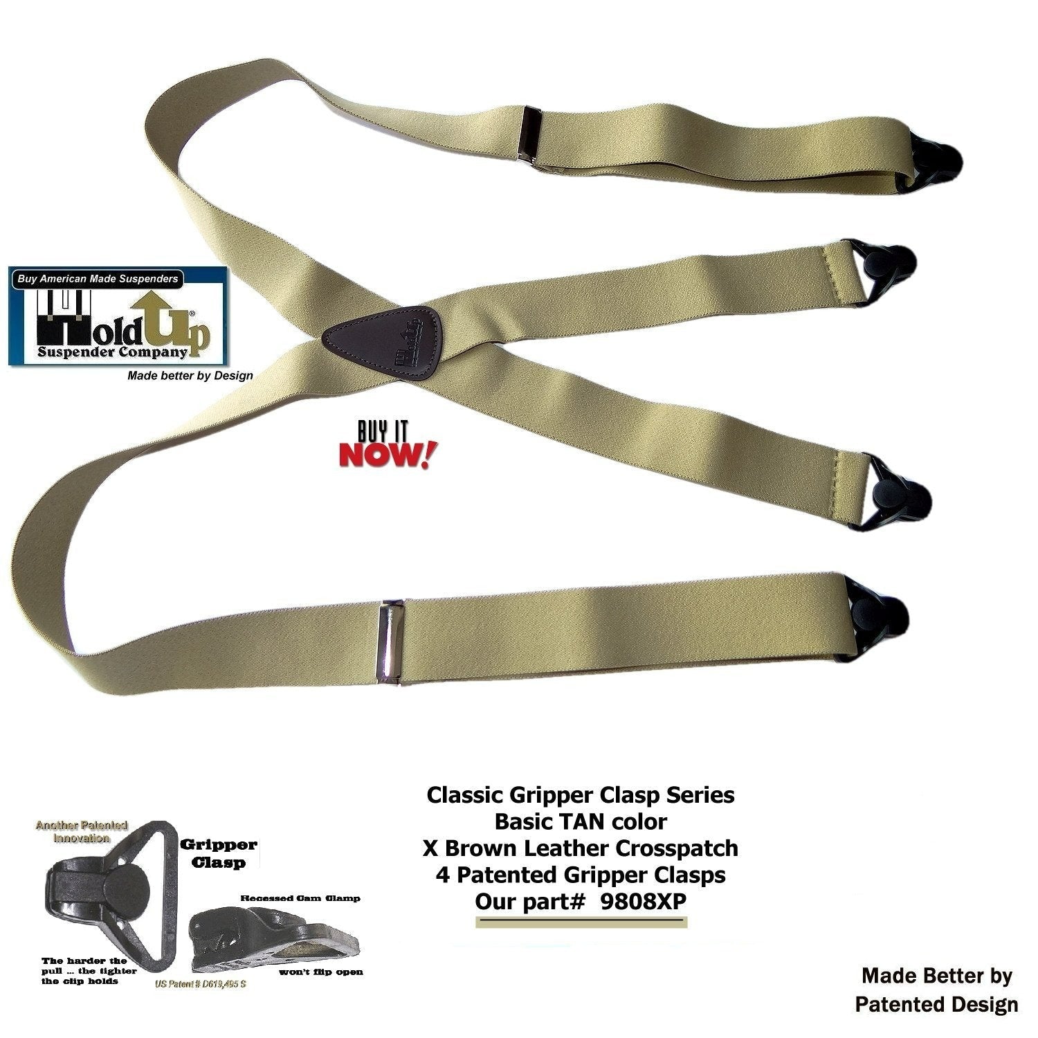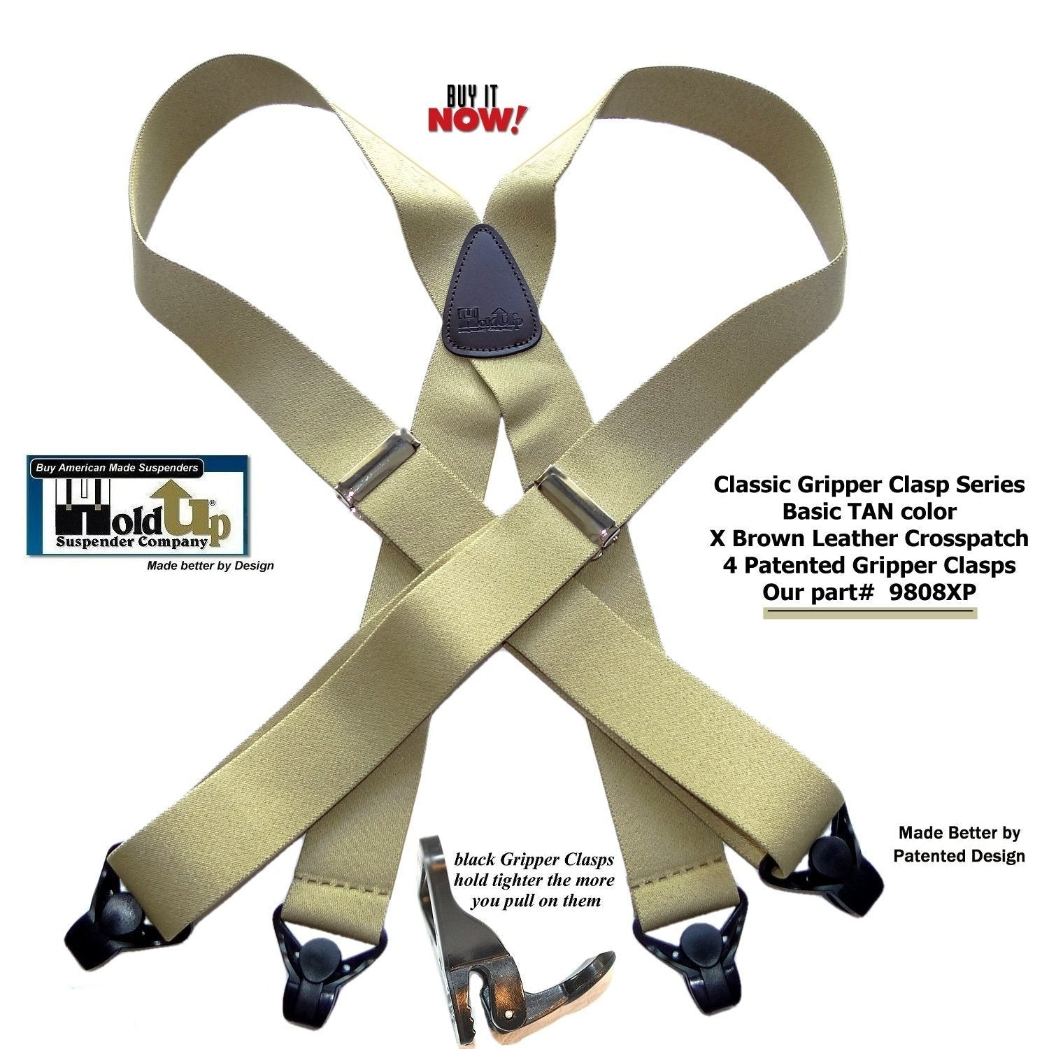 NEW - Classic Series Holdup Suspenders now come in a Classy "Tan" solid color washable strap available now in our new Amazon powered Webshop. These Classic Tan colored Holdups Suspenders have a leather X-back style crosspatch embossed with our Holdup logo. These also feature our Patent Black Gripper Clasp suspender clips with Chrome Length adjuster. Bonus: The Harder you Pull on Our Patented Black Gripper Clasp the Tighter is told on the waist band. Guaranteed to never slip, slide, or fly off your pants. Our USA Patented Holdup X-Back Suspenders are a Perfect choice for low cost Holdup brand patented suspenders. These Khaki, Tan Classic Holdups are 1 1/2" wide, adjustable to 48" in length. Adjustable so they comfortably fit men to 6" tall. HoldUp Suspenders carry a 30 day 100% satisfaction money back guarantee. Purchase using your PayPal or Amazon membership account and take advantage of our free freight option.