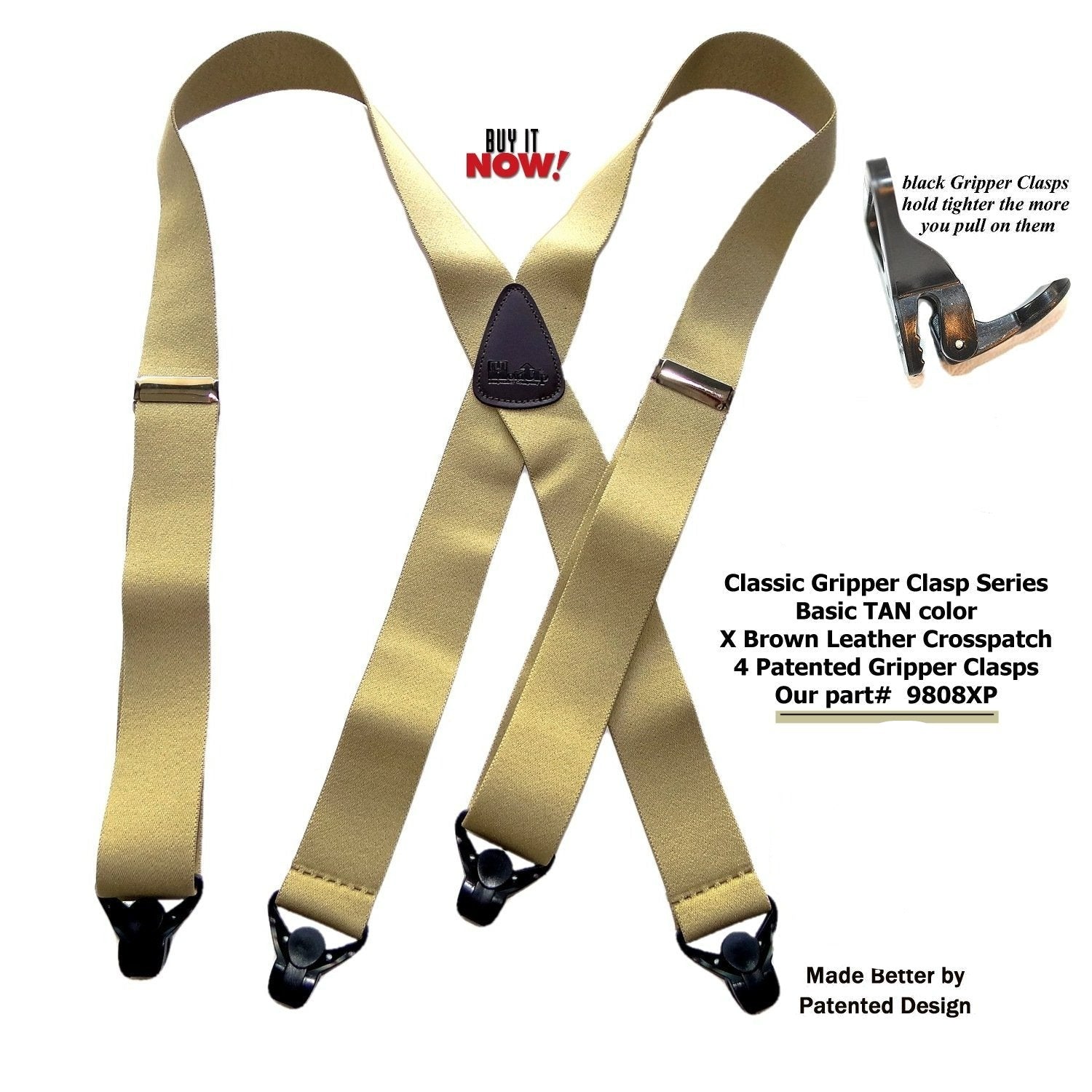 Classic Series X-back Tan colored bargain priced Holdup suspenders with Black Patented Gripper clasp.