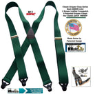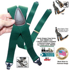 NEW - Classic Series Holdup Suspenders now come in a Classic Dark green color with composite plastic strong Gripper Clasps. These green USA made X-back suspenders has hand washable straps and available now in our new Amazon powered Web shop at HoldupSuspenders.com. These green colored Holdups have top grade black leather X-back style crosspatch embossed with our Holdup logo. These also have our Patent Black Gripper Clasp suspender clips with Chrome Length adjuster. Bonus: The harder you pull on the Gripper Clasp the tighter they hold on your pants. Guaranteed to never slip, slide, or fly off your pants these dark green USA MADE Holdup X-Back Suspenders are the best choice in low-cost Holdup brand patented suspenders. These green Classic X-back Holdups are 1 1/2" wide and 48 inches long adjustable so they comfortably fit men to 6" tall. HoldUp Suspenders carry a 30 day 100% satisfaction money back guarantee. Purchase using your PayPal or Amazon membership account and take advantage of our free freight option.