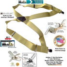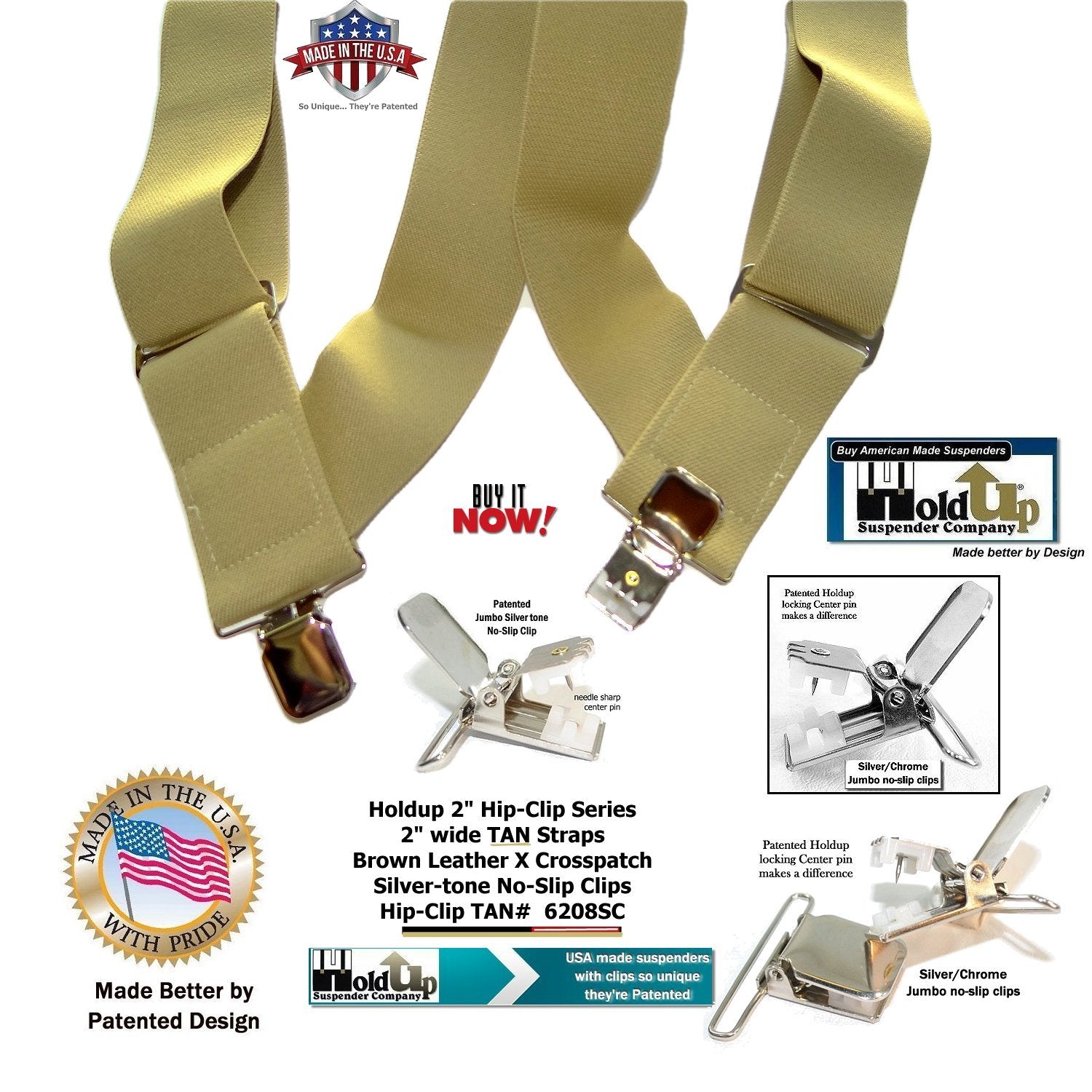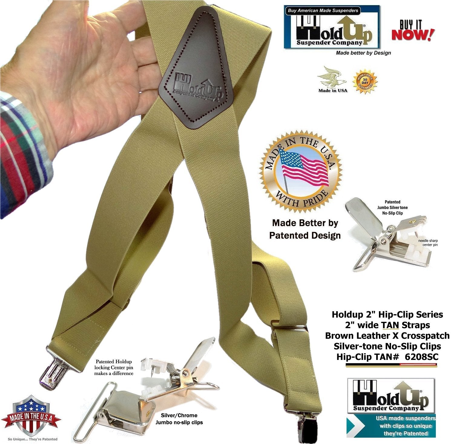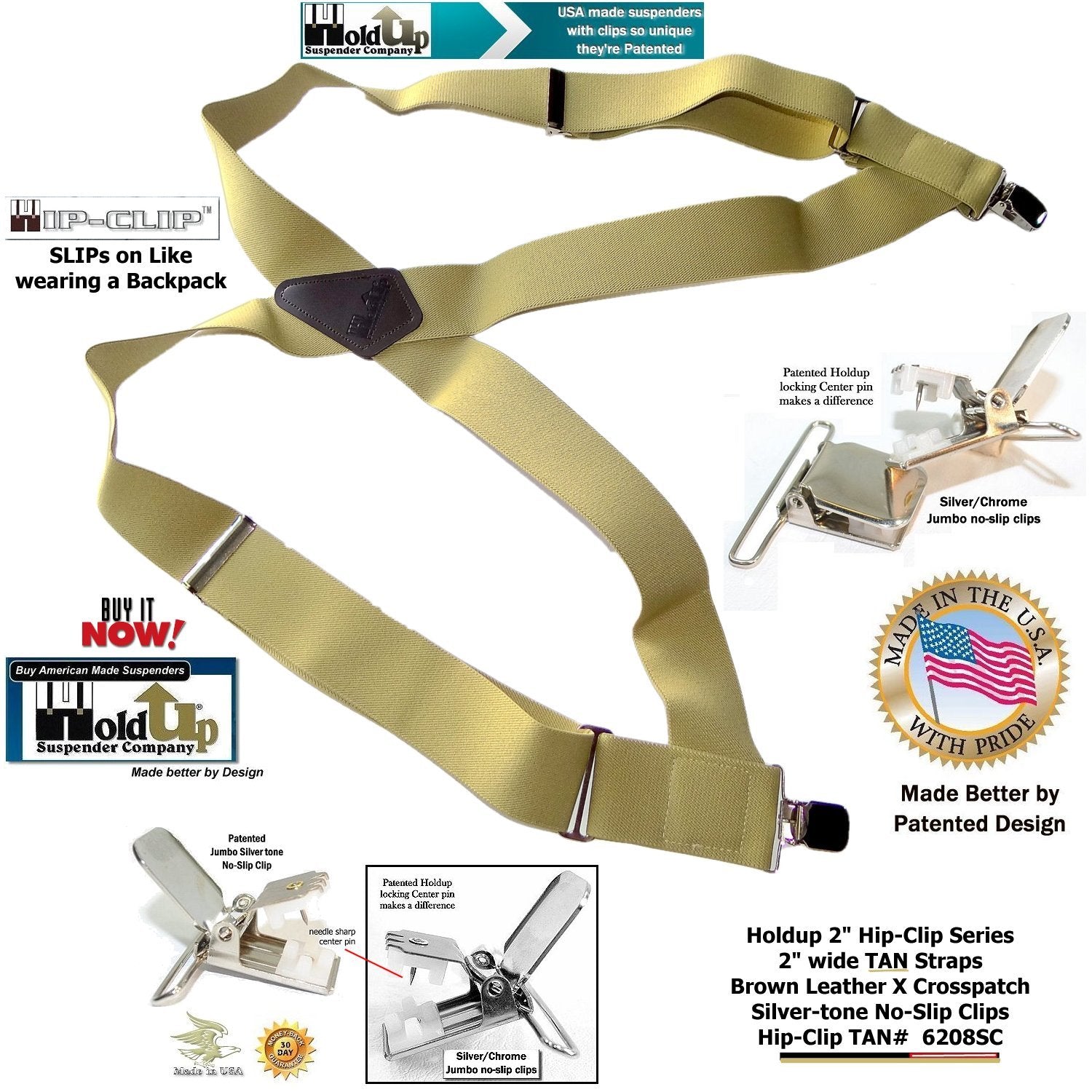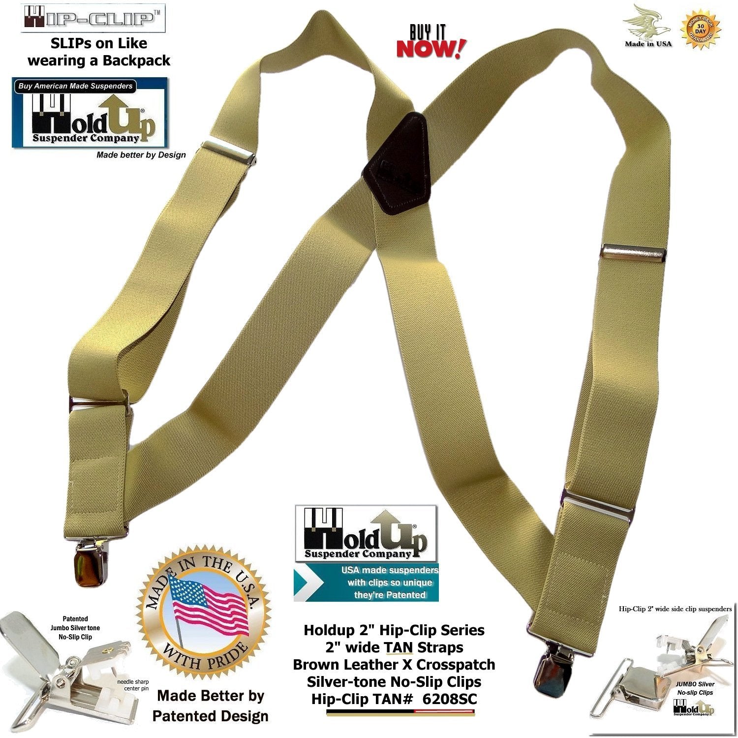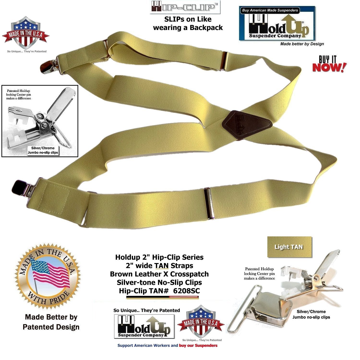 The USA Holdup Suspender Company has done it again and introduces an innovative trucker, or side-clip suspender called the Hip-Clip. This pair sold in our new HoldupSuspenders.com webshop is a light TAN color with 2" wide American made cotton poly-blend elastic straps and silver-tone jumbo patented NO-SLIP clips. These are 48" long (adjustable to fit the bigger belly man or one over 6 feet tall). Now you can comfortably hold up any weight pants or blue jeans with just the snap of 2 of our exclusive NO-SLIP clips at the side of your waistband. American made 2" wide Hip-Clip Style TAN heavy duty elastic fabric hand washable straps made better by patented design for years of daily wear. The top-grade genuine brown leather X-back style crosspatch has our trademarked Holdup logo embossed into the leather. Simply place arms through shoulder straps and clamp down the 2 Holdup Suspenders patented jumbo NO-SLIP clips with needle-sharp center pin. The patented Locking needle pin clips will never fray material or fly off your pants when sliding across truck or car seats. Choose the free standard freight option when checking out using your PayPal or Amazon membership account or your favorite Debit/credit card.