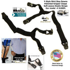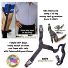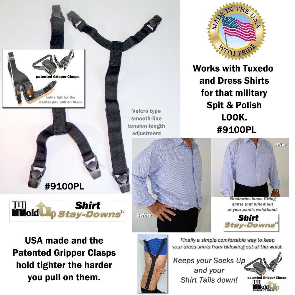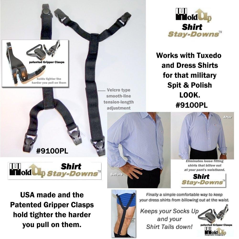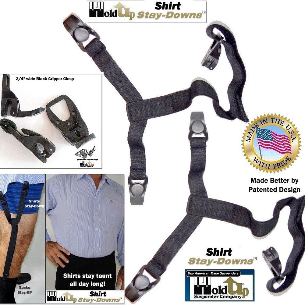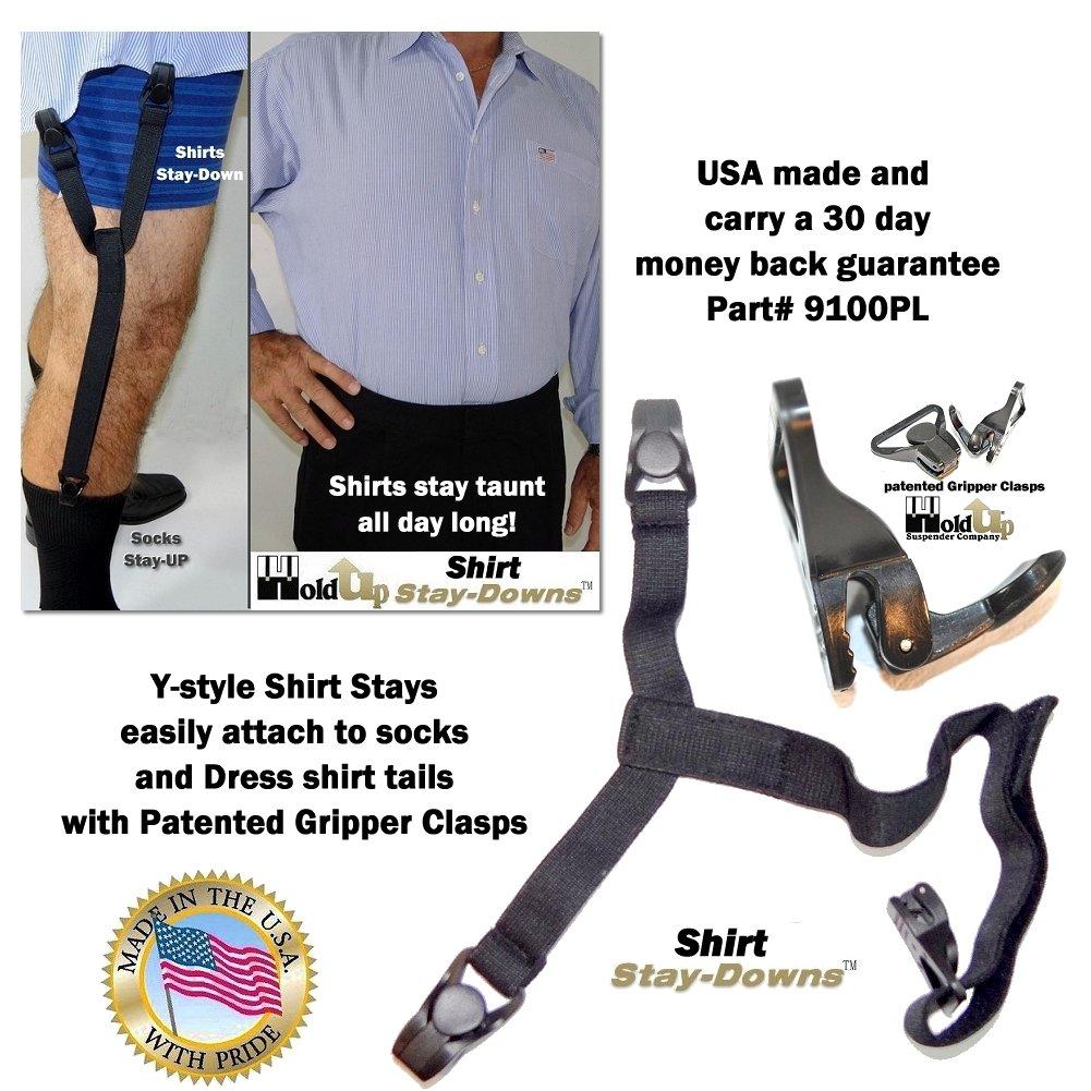 Holdup Suspender Company makes these patented Shirt Stay-Downs that gives you that best dressed fitted shirt look as they keep your shirt tails tightly in your pants. Inspired by those tricks to get that "spit and polish" look during military dress code inspections comes the Holdup trademarked Stay Downs. Get the proven simple solution to eliminate bulging rumpled looking dress or uniform shirts billowing out at your waist. These comfortable Y-style Shirt Stay-Downs simply attach at one end to your socks in seconds with patented Gripper clasps. The other end attaches to your shirt tail, and the smooth Velcro length adjustment system is used to lock in place the adjusted length so your shirt looks tight when sitting or standing in total comfort. The patented gripper clasps are cam activated which means the harder you pull on them the tighter they grip. The simple way to keep shirt tucked in place, while keeping your socks up. The results are impressive and last all day long. Made in the U.S.A and come with a 100% 30 day satisfaction guarantee. Read all the other brand reviews and then these Dress shirt tail stays, or men's shirt tail garters, have none of the problems and work all day long without popping off when sitting or standing.