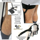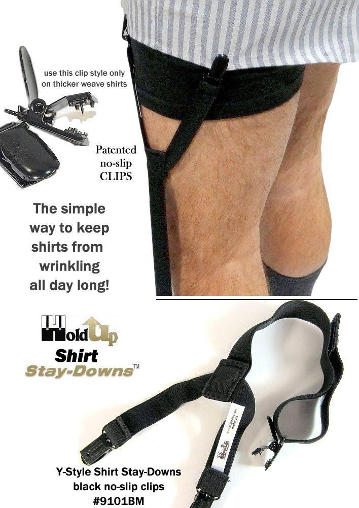 Hold-ups patented Y-style Shirt Stay-Downs gives you that best dressed fitted shirt look by eliminating billowing shirts at your waistline. Get that "spit and polish" look seen during military dress code inspections where everyone has a wrinkle free tucked in shirt. Now Comes a simple solution to eliminate bulging rumpled looking dress shirts billowing out at your waist. These comfortable Shirt Stay-Downs simply attach at one end to your socks in seconds with patented metal No-slip clips in black. The dual Y-section has 2 matching black No-slip patented clips with locking center pin that attaches to your shirt tail in 2 places. The unique smooth line Velcro length adjustment system is used to lock in place the proper length to give you a comfortable tension between the sock clip and the shirt tail clips. We recommend using this patented Y-style Holdup shirt Stay with thicker dress or uniform shirts rather than thin silky formal shirts due to the metal no-slip clips needle sharp center locking pin that might fray fragile material.
