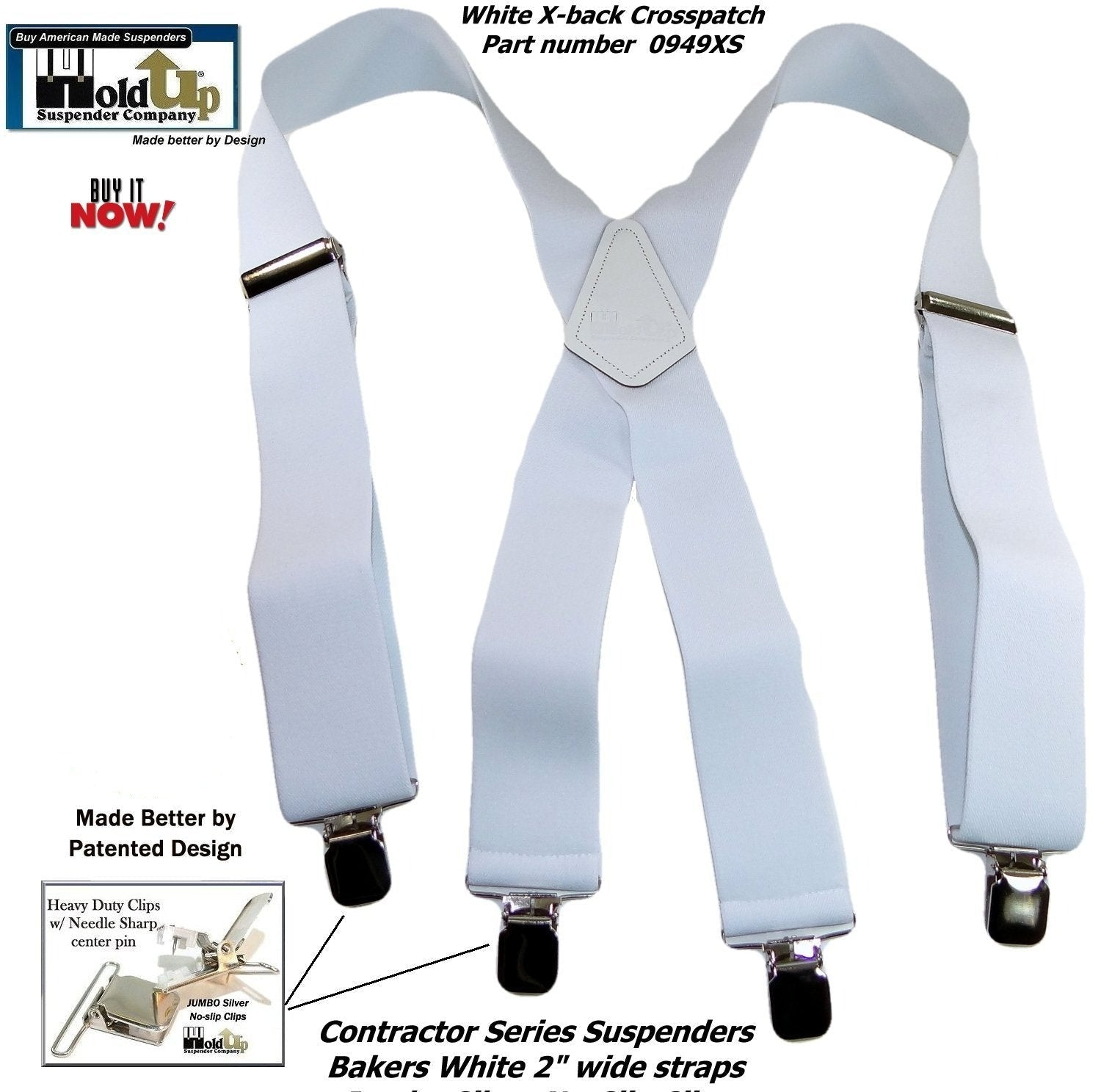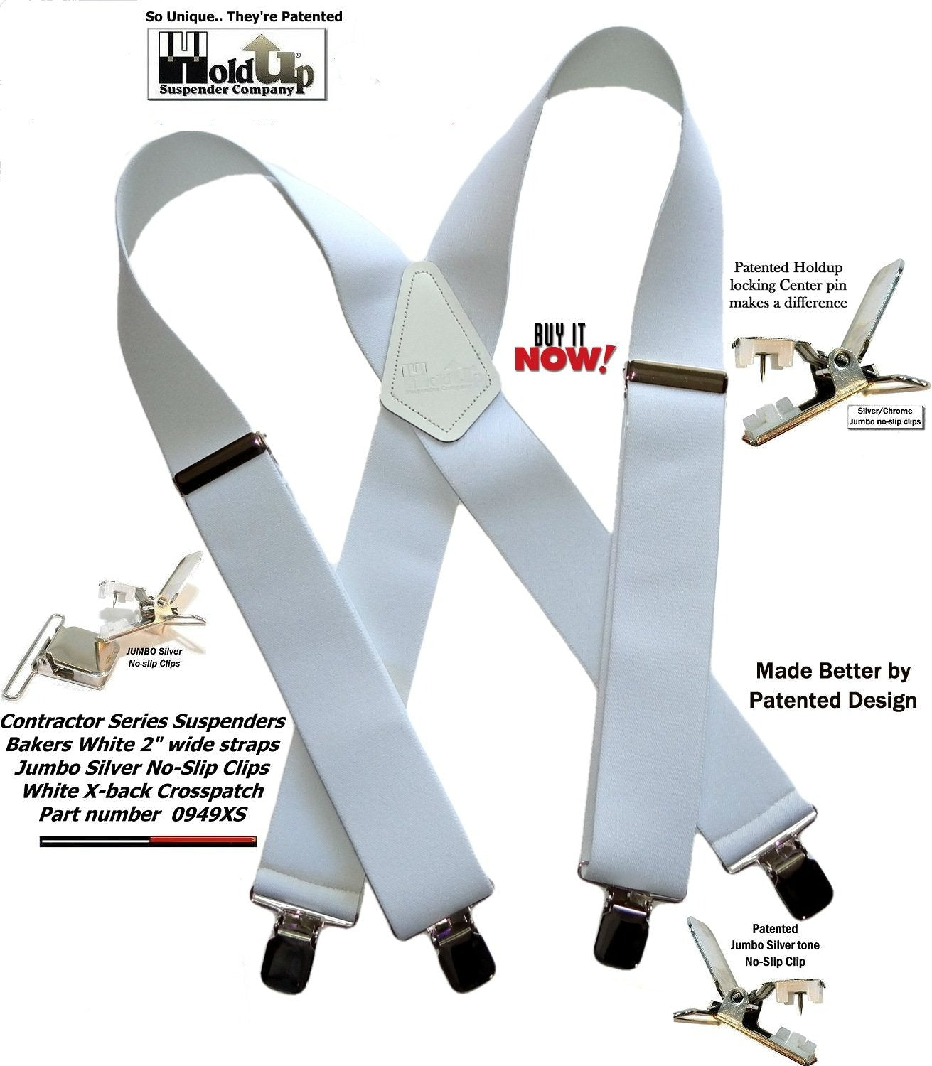 Bakers White 2" wide Contractor Series Holdup brand X-back suspenders are specifically designed for securely holding up a working man's pants. With everything imaginable hanging from your trousers it's hard to keep them up with just an ordinary belt and these all-white Holdup wide work suspenders are popular with cooks and restaurant workers and Bakers. Contractor series Holdup suspenders are specially designed with wider Cotton Poly-blend hand washable elastic straps and our USA patented jumbo metal No-slip Clips with locking center pin design to assure you're pants are Always Up.