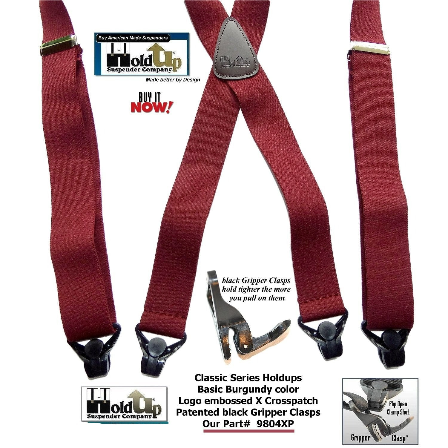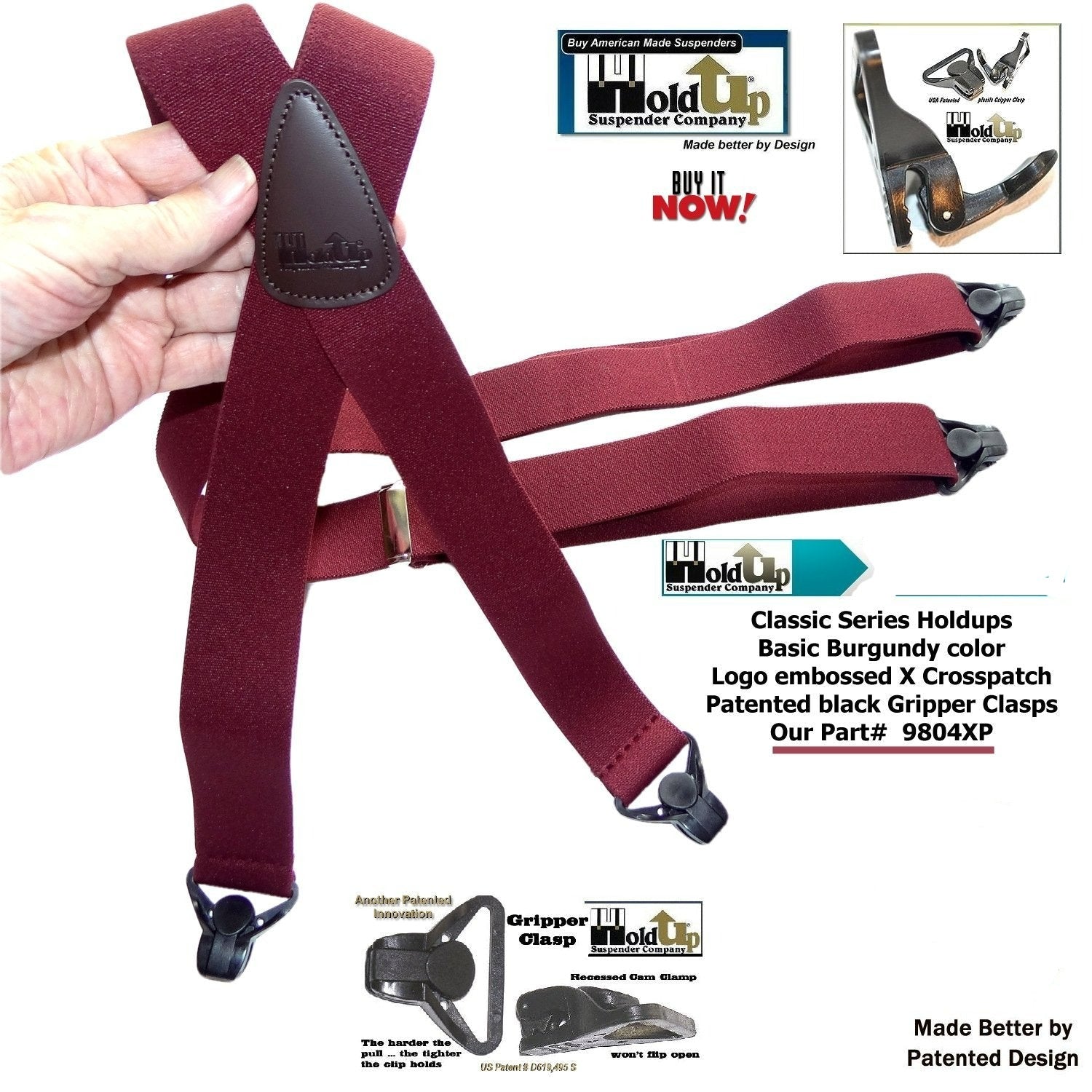 Classic X-back burgundy colored X-back bargain priced Holdup suspenders with Gripper clasp are made in the USA
