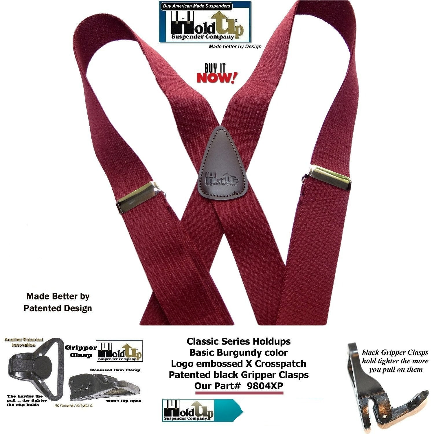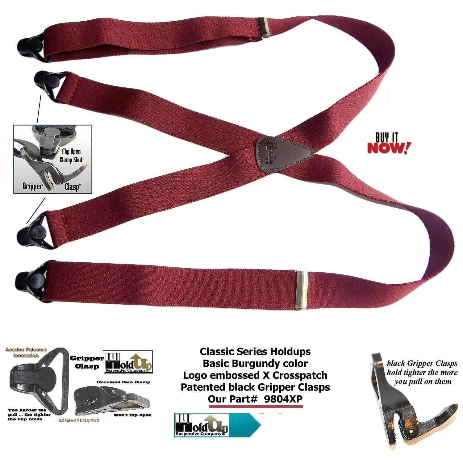 NEW - Classic Series Holdup Suspenders now come in a Classic Dark "Burgundy" solid color washable strap available now in our new Amazon powered Web shop. These Burgundy colored Holdups have top grade black leather X-back style crosspatch embossed with our Holdup logo. These also have our Patent Black Gripper Clasp suspender clips with Chrome Length adjuster. Bonus: The harder you pull on the Gripper Clasp the tighter they hold on your pants. Guaranteed to never slip, slide, or fly off your pants. Our Classic Holdup X-Back Suspenders are the best choice in low-cost Holdup brand patented suspenders. These Dark Burgundy Classic Holdups are 1 1/2" wide, adjustable to 48" in length and adjustable so they comfortably fit men to 6" tall. HoldUp Suspenders carry a 30 day 100% satisfaction money-back guarantee. Purchase using your PayPal or Amazon membership account or favorite credit card and take advantage of our free freight option here on all orders.