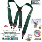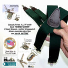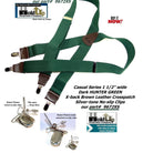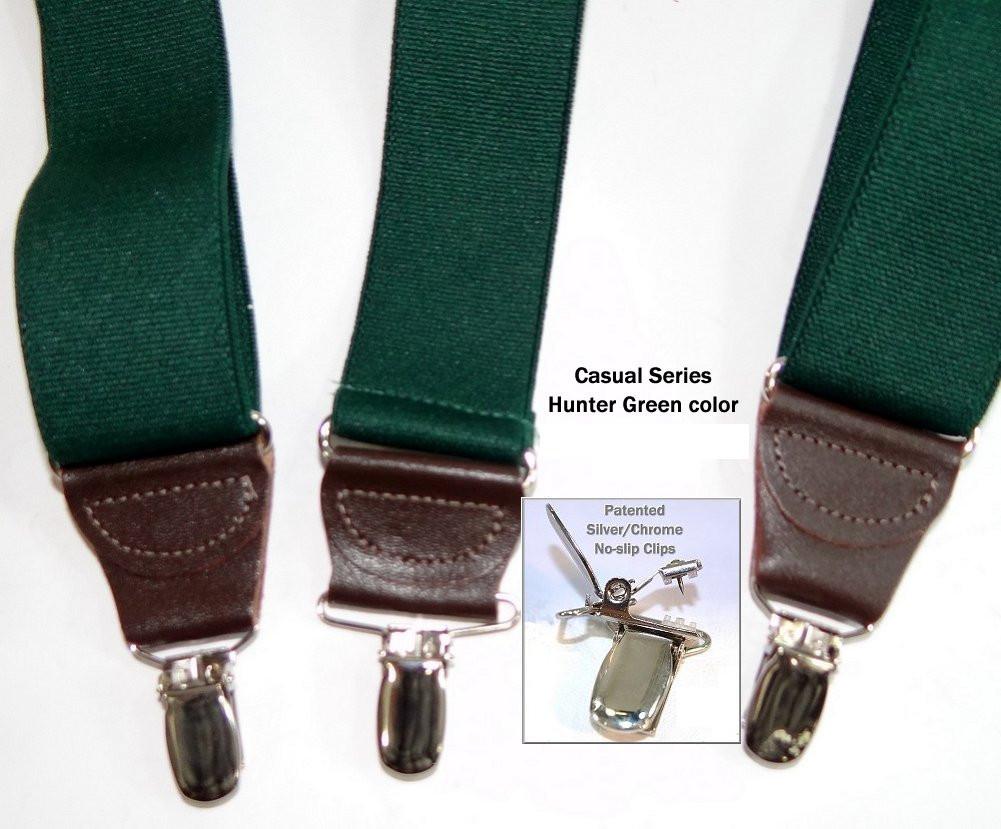 HoldUp's Casual Series in a dark "HUNTER GREEN" solid colored USA made men's clip-on suspenders featuring our patented no-slip clips in silver/chrome finish. These are 1 1/2" wide and adjustable to 48" in length so they fit men to 6 feet tall. This X-back style and the neutral dark green color is great for office or casual wear when you need to make a conservative fashion statement! Pick out several pair of Casual Series Holdups in your favorite colors which all have rich brown top grade leather tapered clip tab holders and matching brown leather X-back crosspatch embossed with trademarked Holdup logo. Buy using your Amazon or PayPal account and get free freight offer at checkout.