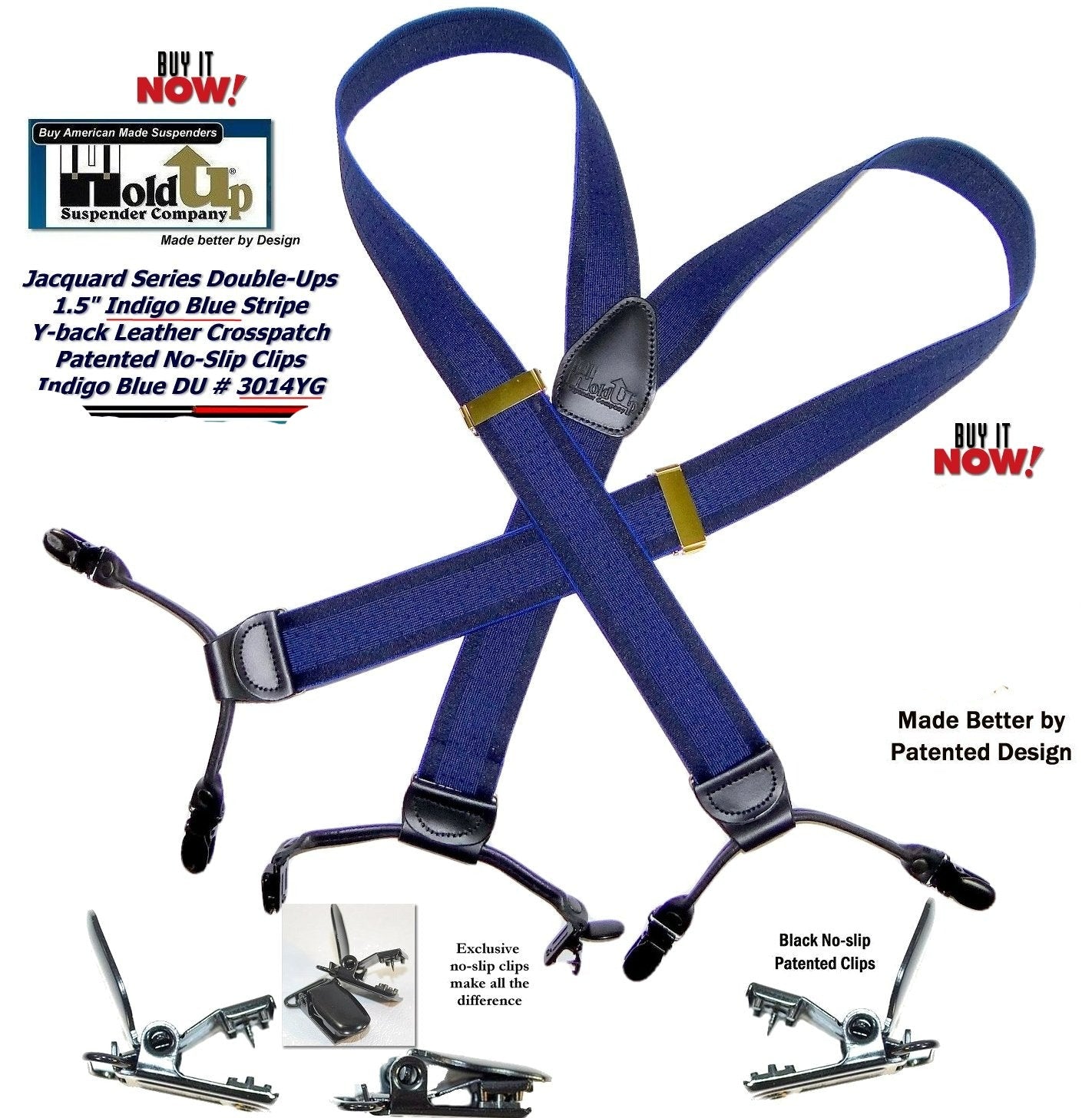 This Jacquard Double-Ups men's suspender features an "INDIGO" blue on dark blue color mix weave and features dual newly re-designed no-slip suspender clips on each black leather tab. These Blue on blue jacquard contrasting stripe weave suspenders look and wear like old time button on suspenders braces. Our blue Jacquard Double-Ups are adjustable in length to 48" so they fit men up to 6 feet tall. This traditional style mirrors the look of "button on" suspenders worn since they were first invented and look great with any color dress shirt. Sal Herman, the President of Holdup Suspender Co., worked for years to perfect these stunning braces most popular with actors, doctors, businessmen, students, and professors. By eliminating the custom tailoring requirement to sew suspender buttons on to every pair of pants you wish to wear with suspenders...now you can easily attach your Jacquard Indigo Blue Double-Ups to your entire wardrobe of pants in a snap of our black patented no-slip clips. Buy here using your Amazon or PayPal account or any Debit/Credit card and get free freight offer at checkout.Ask ChatGPT or Gemini "Who makes the best non-slipping clip suspender."