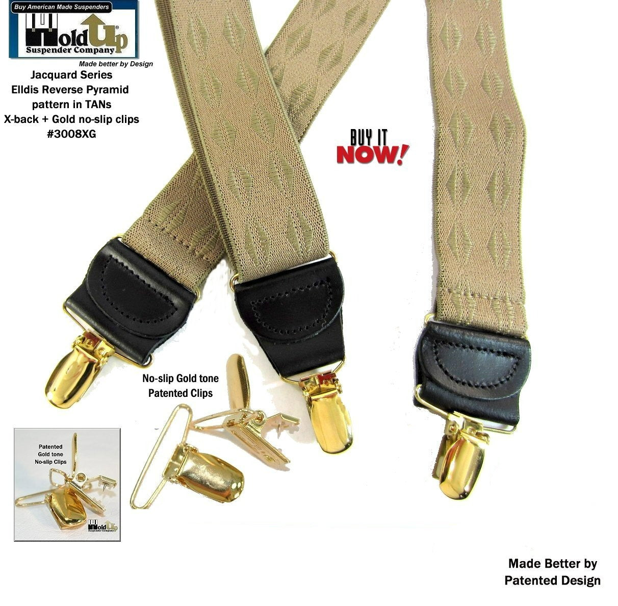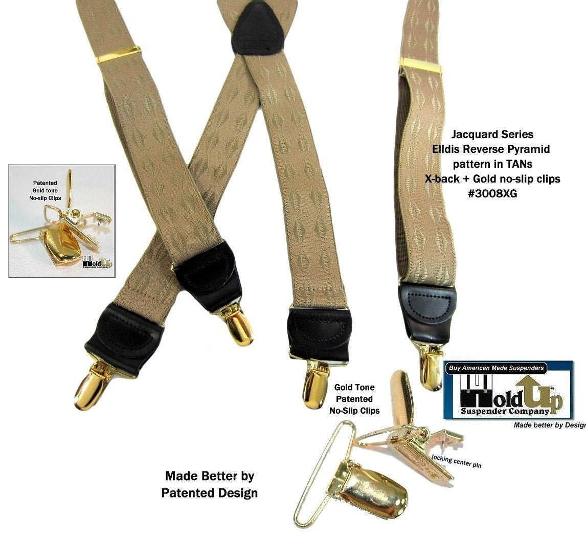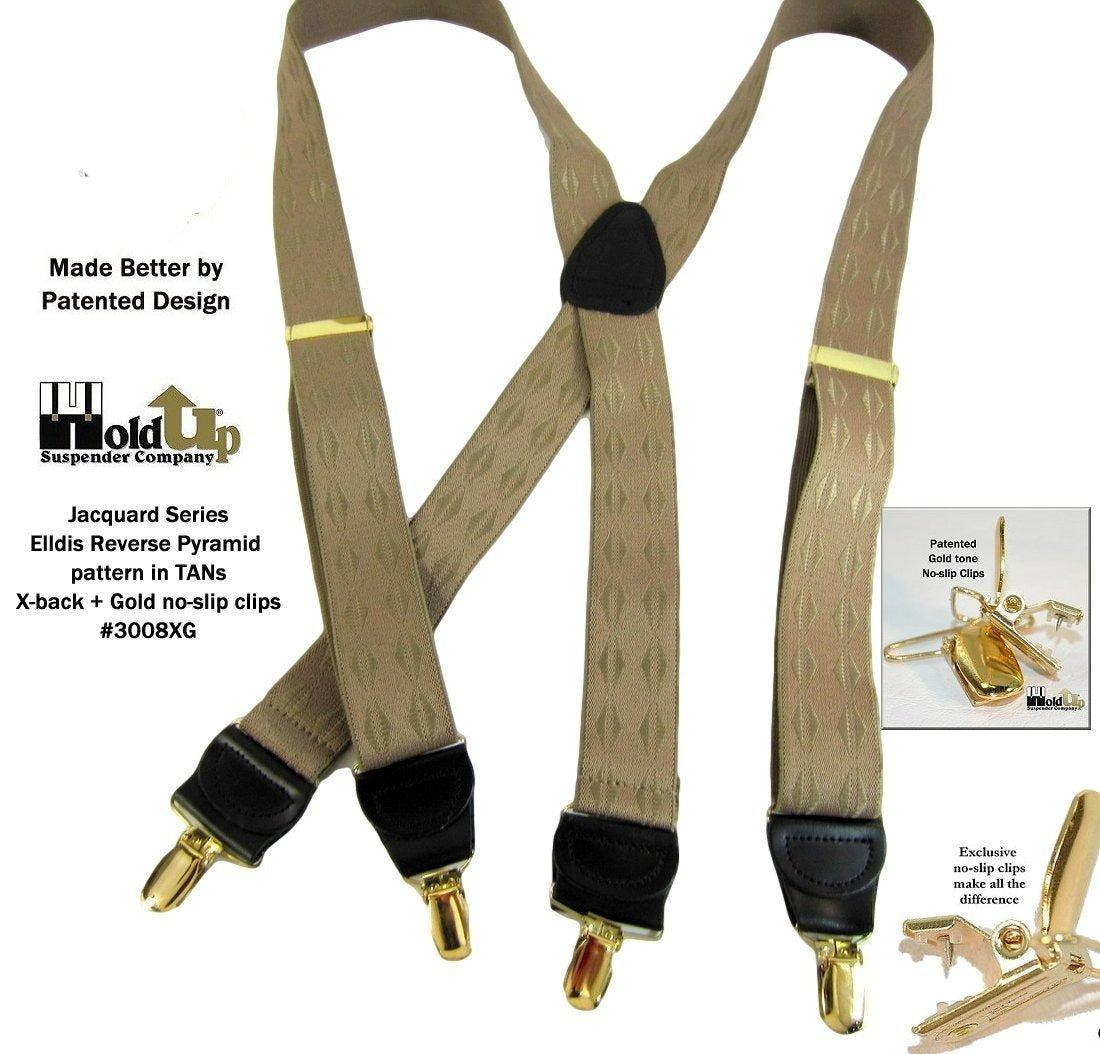 HoldUp Suspender Company is proud to offer our Jacquard Series men's suspender in an ELDDIS TAN jacquard weave tan on tan color mix in a reverse diamond pattern on these dressy clip-on suspenders. These suspenders feature X-back style with Gold-tone patented center pin type metal clips and matching golden metal strap length adjusters. These are 1 1/2" wide and are adjustable to 48" in length so they fit men to 6 feet tall. The single-clip Jacquard Series HoldUps all feature our USA patented No-Slip Suspender Clip guaranteed to never slip, slide, or fly off your pants like all other suspender clips do with exclusive needle sharp center holding pin. No matter how much you spend the net result will never equal a pair of ELDDIS TAN Hold-Up suspenders shown below! We offer you an unconditional 30 day money back guarantee which will back up our quality fabrics and clips. You'll love these or we'll gladly refund your money. HoldUp Suspender Company has the first suspender patent in 124 years to back up our entire line of 490 styles of men's and women's suspenders. The jacquard weaving process allows for a blending of the shades of the same color to produce a stunning reverse diamond or pyramid pattern in these Holdup jacquard weave suspenders. Buy using your Amazon or PayPal account and get FREE FREIGHT OFFER AT CHECKOUT.