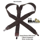 Hold-Up's Casual Series in a dark JAVA Brown solid color men's suspender featuring our patented No-slip clip with nickel metal finish and nickel metal length adjuster. This style comes in Y-back with brown leather crosspatch and goes with all shirt colors and is great for office or casual wear when you need to make a conservative fashion statement! Great as a birthday, Graduation or Father's Day gift. All materials are carefully chosen for elastic durability with a course weave and top grade brown leather logo embossed crosspatch and tapered leather clip tab holders. If you need a pair of dark coco brown clip suspenders that perform year after year...then we'd always suggest a pair of Casual Java brown Hold-up Suspenders for you or a friend. Buy these brown Hold-up Casual series Y-back style now on sale here at Hold's  Amazon web shop.