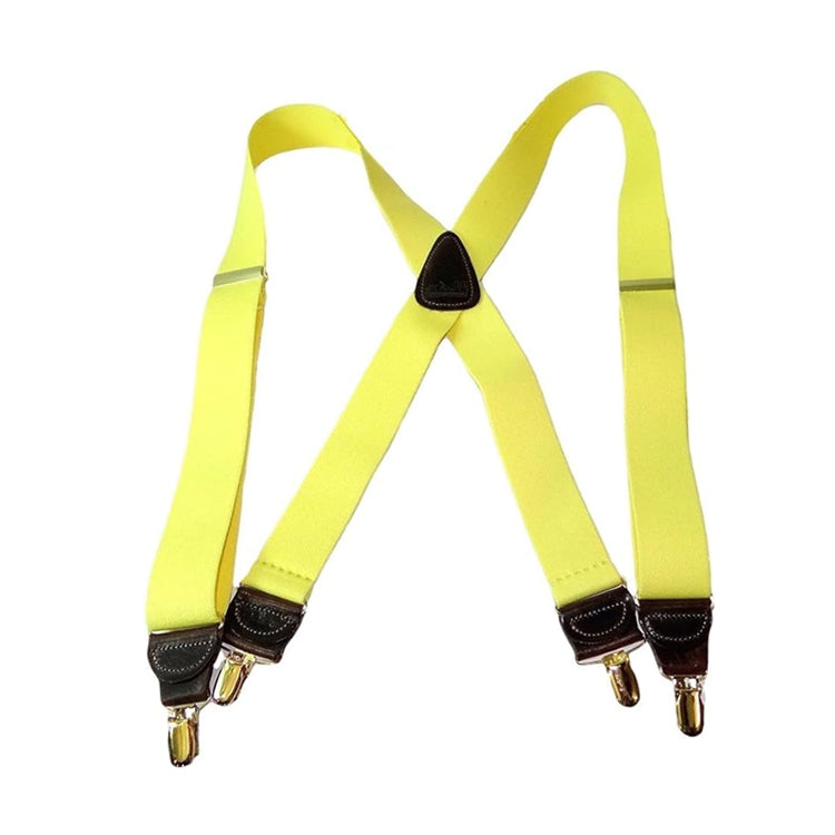 - 1 1/2" wide Pastel Yellow casual pant clip-on suspenders have X-back leahter crosspatch embossed with Hold-upĀ® logo
