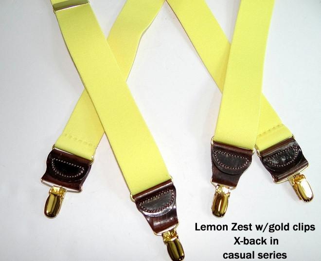 Hold-up's Casual Series in a LEMON ZEST pale yellow solid color men's suspender featuring our USA patented No-slip clip with gold metal finish and length adjuster. These are 1 1/2" wide and 48" long (adjustable). This style comes in X-back with brown leather crosspatch and goes with all shirt colors and is great for office or casual wear when you need to make a conservative fashion statement! Great as a birthday or Father's Day gift. All materials are carefully chosen for elastic durability with a fine weave and top grade brown leather crosspatch and tabs. If you need a pair of suspenders that perform year after year...then we'd always suggest a pair of Hold-up Suspenders for you or a friend. Buy any Hold-up Casual series right here at Amazon. Holdup's exclusive patented clip-on CASUAL SERIES SUSPENDERS all have: Top quality elastic 1 1/2" wide 48" long straps specifically chosen for durability and lasting stretch. All Casual Series Holdups come with the best brown saddle leather tabs that vary in size and taper front to back for more comfort and convenience when attaching them to your pants.... This series features our patented No-Slip Suspender Clip guaranteed to never slip, slide, or fly off like all other suspenders do. Truly a good investment in comfort, fit and style as Hold-up Brand suspenders come in over 250 styles and colors.