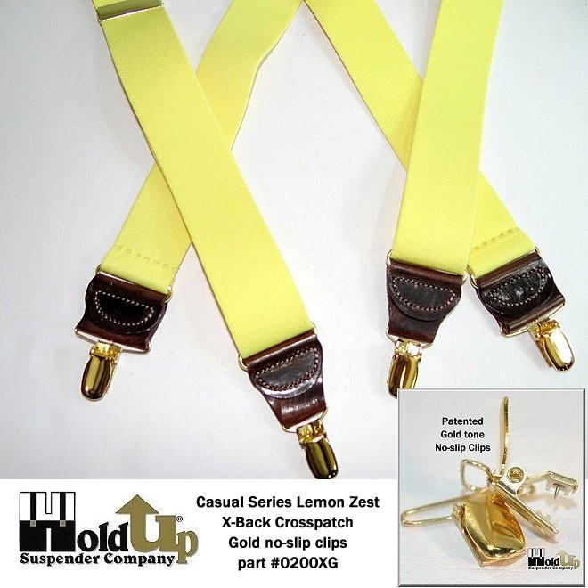 - Pastel Lemon yellow clip-on Hold-upĀ® suspenders have gold tone patented no-slipĀ® clips