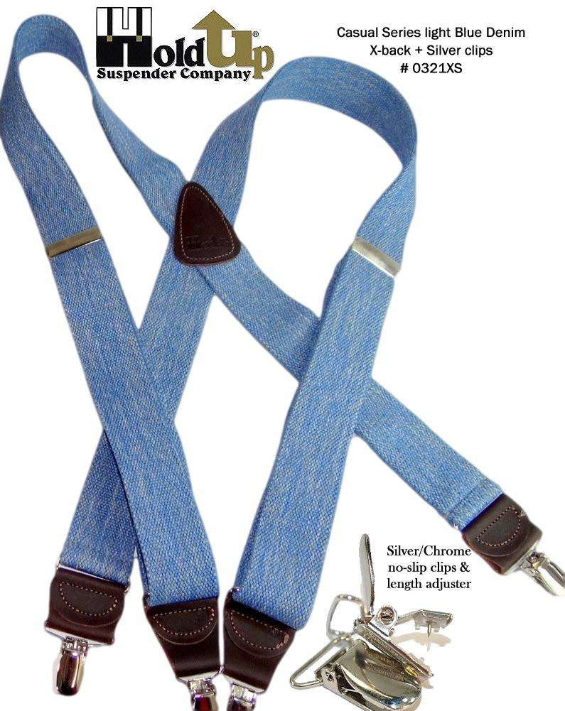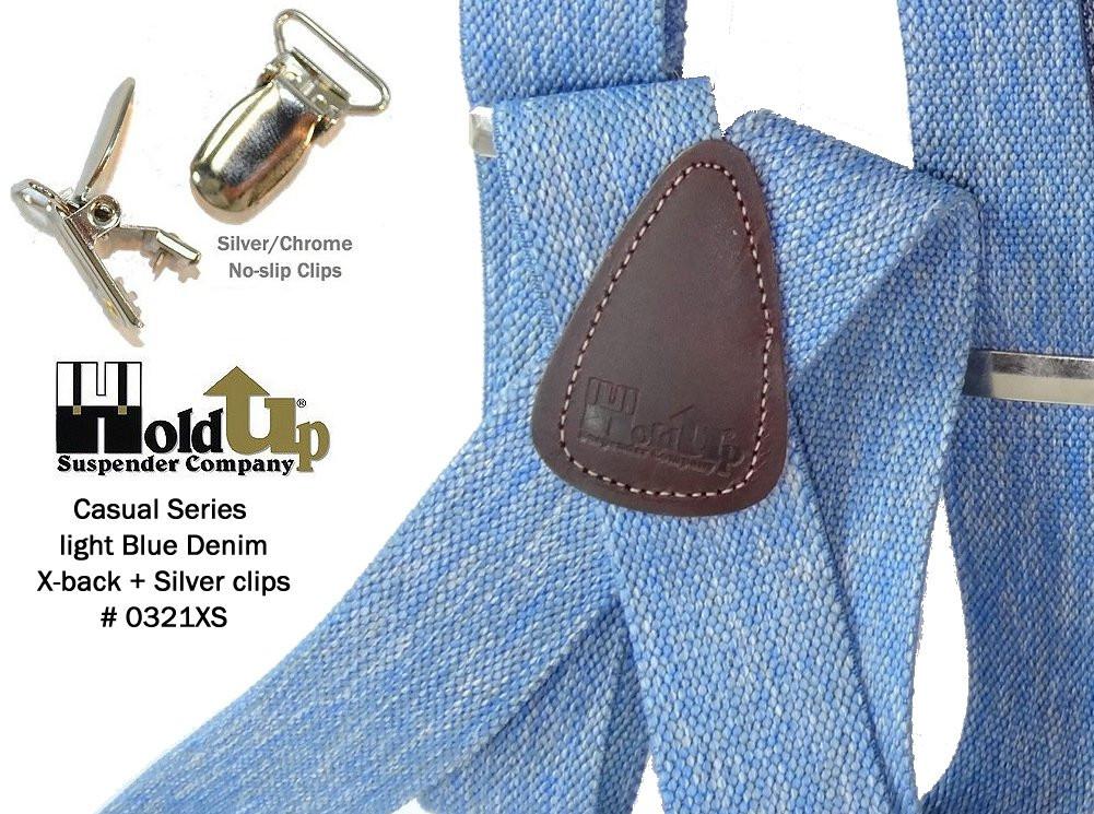 Holdup Brand Light Blue Denim color Suspenders with 1 1/2" wide straps in X-back styles with USA Patented No-slip Silver Clips
