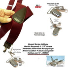 - Tapered leather tabs and double stitched X-back crosspatch embossed with trademarked Holdup Logo assure your getting the real Holdup Brand Merlot suspender!