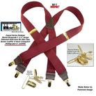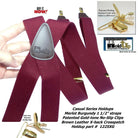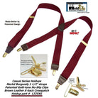 - 1 1/2" wide MERLOT (Burgundy) casual suspenders with X-Back and gold-tone patented NO-SLIP® clips with needle sharp center pin.
